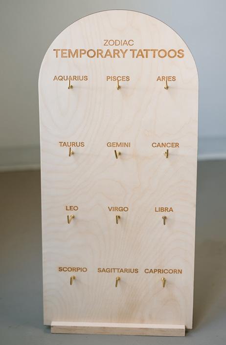 EACH ZODIAC SIGN IS ENGRAVED ON THE DISPLAY. INCLUDES WOODEN DISPLAY BOARD, WOODEN BASE, 12 GOLD L HOOKS. HOLDS 144 TATTOOS.