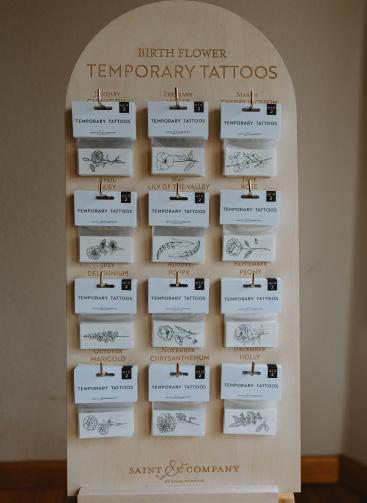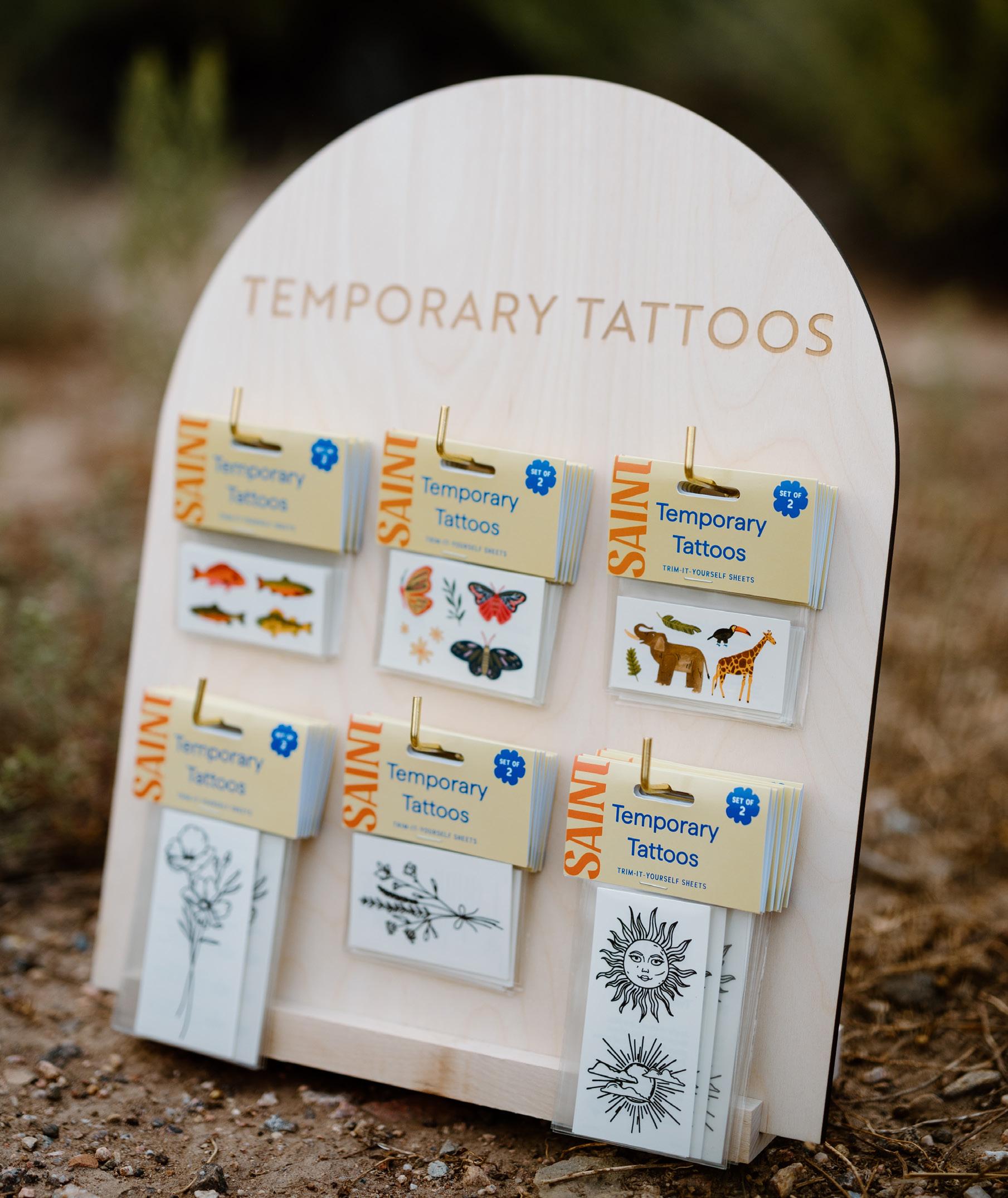 OUR TEMPORARY TATTOO DISPLAY STANDS ARE ALL HANDCRAFTED IN COLORADO. ALL DISPLAYS CAN DISPLAY UP TO 12 TATTOOS PER HOOK, BUT 6 PER HOOK IS RECOMMENDED TO LOOK FULLY STOCKED. SINCE WE CREATE THESE LOCALLY, DISPLAYS CAN BE MADE-TO-ORDER, SO CONTACT US AT HELLO@SAINTTATTOOS.COM IF YOU HAVE A SPECIAL REQUEST!