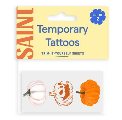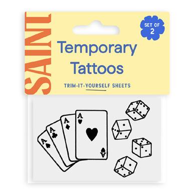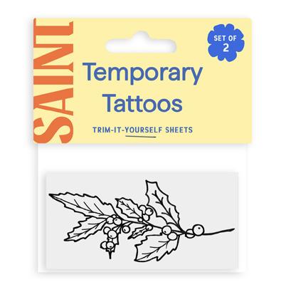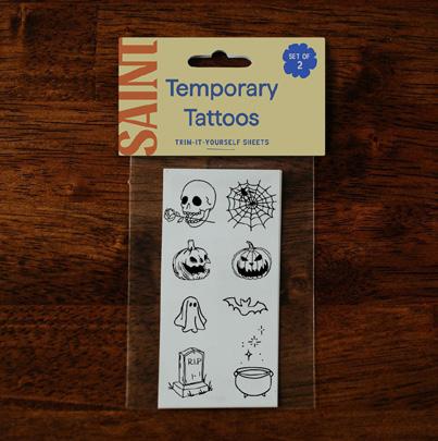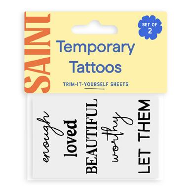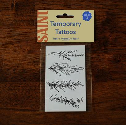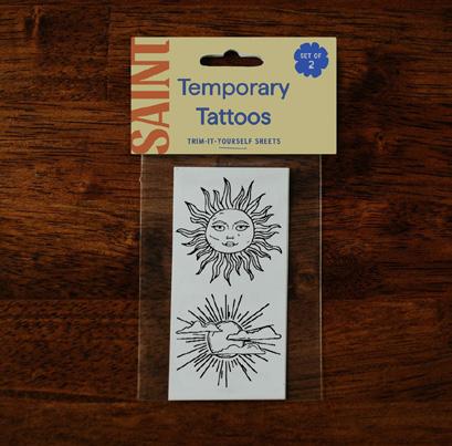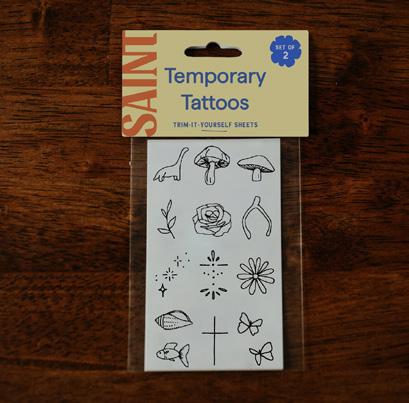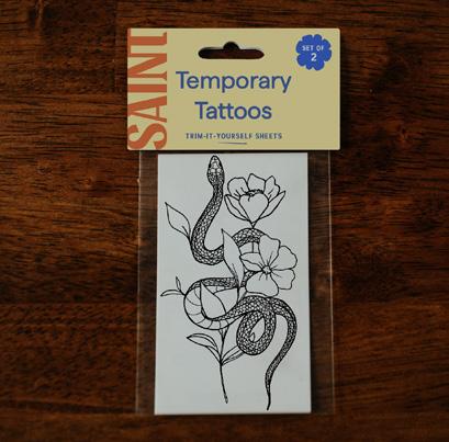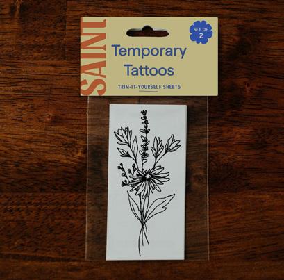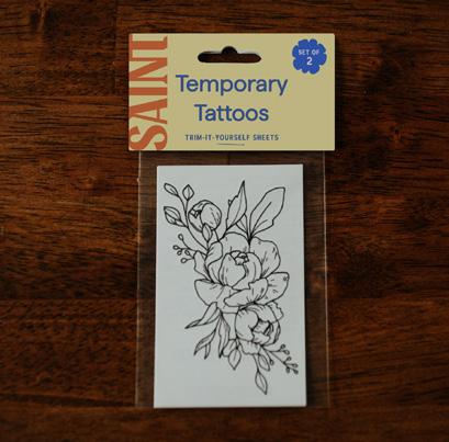 OUR TATTOOS TYPICALLY LAST 1-5+ DAYS, DEPENDING ON PLACEMENT AND CARE. FOR THE BEST APPLICATION, BE SURE SKIN IS DRY AND FREE OF OIL, LOTION, AND MAKEUP. FOR MORE FAQs, VISIT: SAINTTATTOOS.COM/TEMPORARY-TATTOO-FAQ