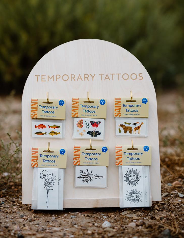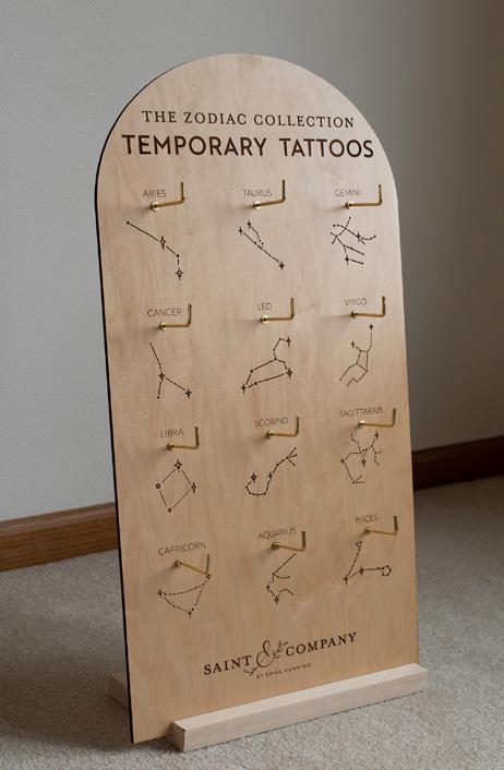OUR TEMPORARY TATTOO DISPLAY STANDS ARE ALL HANDCRAFTED IN COLORADO. ALL DISPLAYS CAN DISPLAY UP TO 12 TATTOOS PER HOOK, BUT 6 PER HOOK IS RECOMMENDED TO LOOK FULLY STOCKED. SINCE WE CREATE THESE LOCALLY, DISPLAYS CAN BE MADE-TO-ORDER, SO CONTACT US AT HELLO@SAINTTATTOOS.COM IF YOU HAVE A SPECIAL REQUEST!