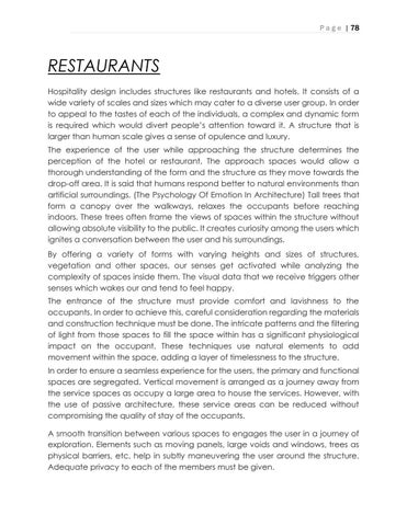 RESTAURANTS Hospitality design includes structures like restaurants and hotels. It consists of a wide variety of scales and sizes which may cater to a diverse user group. In order to appeal to the tastes of each of the individuals, a complex and dynamic form is required which would divert people’s attention toward it. A structure that is larger than human scale gives a sense of opulence and luxury. The experience of the user while approaching the structure determines the perception of the hotel or restaurant. The approach spaces would allow a thorough understanding of the form and the structure as they move towards the drop-off area. It is said that humans respond better to natural environments than artificial surroundings. (The Psychology Of Emotion In Architecture) Tall trees that form a canopy over the walkways, relaxes the occupants before reaching indoors. These trees often frame the views of spaces within the structure without allowing absolute visibility to the public. It creates curiosity among the users which ignites a conversation between the user and his surroundings. By offering a variety of forms with varying heights and sizes of structures, vegetation and other spaces, our senses get activated while analyzing the complexity of spaces inside them. The visual data that we receive triggers other senses which wakes our and tend to feel happy. The entrance of the structure must provide comfort and lavishness to the occupants. In order to achieve this, careful consideration regarding the materials and construction technique must be done. The intricate patterns and the filtering of light from those spaces to fill the space within has a significant physiological impact on the occupant. These techniques use natural elements to add movement within the space, adding a layer of timelessness to the structure. In order to ensure a seamless experience for the users, the primary and functional spaces are segregated. Vertical movement is arranged as a journey away from the service spaces as occupy a large area to house the services. However, with the use of passive architecture, these service areas can be reduced without compromising the quality of stay of the occupants. A smooth transition between various spaces to engages the user in a journey of exploration. Elements such as moving panels, large voids and windows, trees as physical barriers, etc. help in subtly maneuvering the user around the structure. Adequate privacy to each of the members must be given.