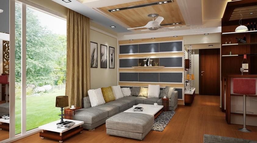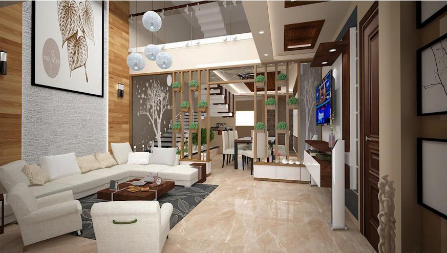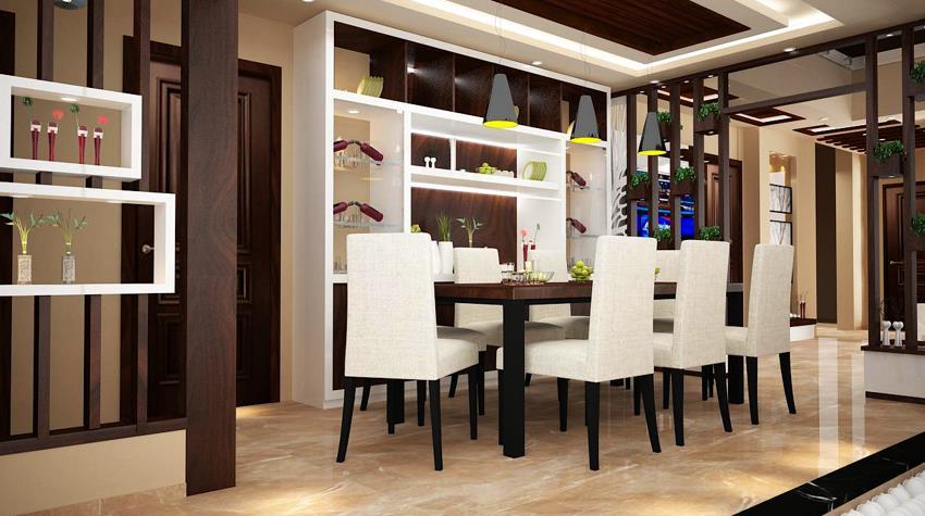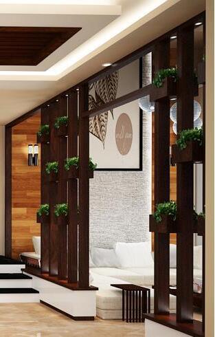 ▪ This living area blends elegance, functionality, and warmth, redefining luxury living. Key features include a wooden partition with green accents for added privacy and a natural touch. The open layout connects the foyer, living, and dining areas, enhancing flow and continuity.