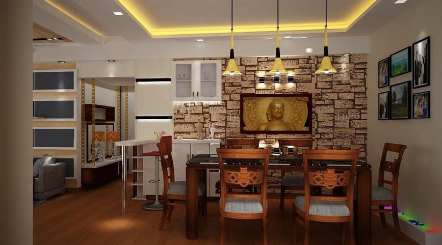 ▪ Dining Area: A warm dining area centred around a golden Buddha relief against a textured script backdrop. The wooden table with intricately carved chairs exudes tradition, while soft pendant lighting creates a cozy atmosphere. Built-in cabinetry and a bar add practicality to the design.