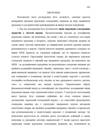169 ВИСНОВКИ Поставленої мети дослідження було досягнуто, оскільки вдалося виокремити феномен мережевих електронних журналів як виду видавничої продукції та дослідити їхню трансформацію як явище масової комунікації. 1. Під час дослідження було встановлено місце мережевих електронних журналів у системі видань. Проаналізувавши підходи до класифікації мережевих видань, ми визначили, що жодні з них не охоплюють усіх видів видавничої продукції в інтернеті, оскільки намагання побудови матриці на основі іншої системи призводить до викривлення реальної картини видової різноманітності в мережі. Спроба накласти матрицю державного стандарту на явище МЕЖ призвела до створення дефініції, що не виражала повністю сутності поняття. Окресливши типологічні ознаки, що вирізняють мережеві електронні журнали в окремий вид видавничої продукції, ми визначили, що МЕЖ – це детерміноване періодичне чи продовжуване електронне видання, що пройшло редакційно-видавничу обробку, параметри, зміст і спосіб взаємодії з яким визначені видавцем і не можуть бути змінені користувачем, призначене для поширення в незмінному вигляді в комп’ютерних мережах і доступне потенційно необмеженому колу читачів, не має друкованого аналогу, містить текст