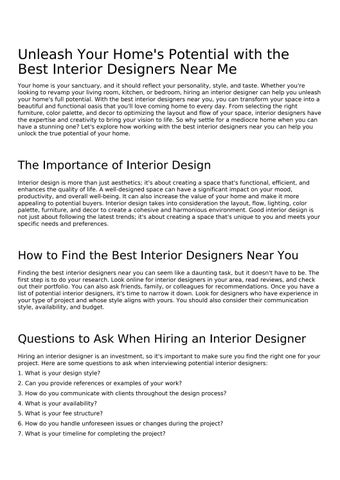 Unleash Your Home's Potential with the Best Interior Designers Near Me Your home is your sanctuary, and it should reflect your personality, style, and taste. Whether you're looking to revamp your living room, kitchen, or bedroom, hiring an interior designer can help you unleash your home's full potential. With the best interior designers near you, you can transform your space into a beautiful and functional oasis that you'll love coming home to every day. From selecting the right furniture, color palette, and decor to optimizing the layout and flow of your space, interior designers have the expertise and creativity to bring your vision to life. So why settle for a mediocre home when you can have a stunning one? Let's explore how working with the best interior designers near you can help you unlock the true potential of your home.