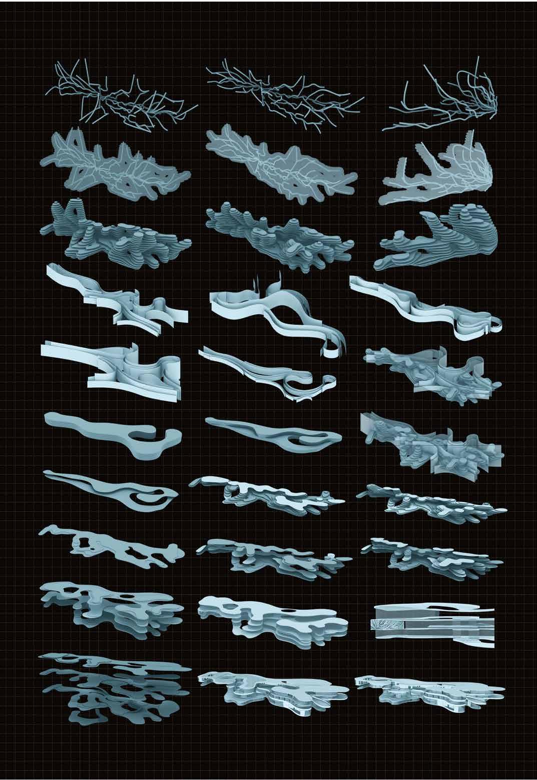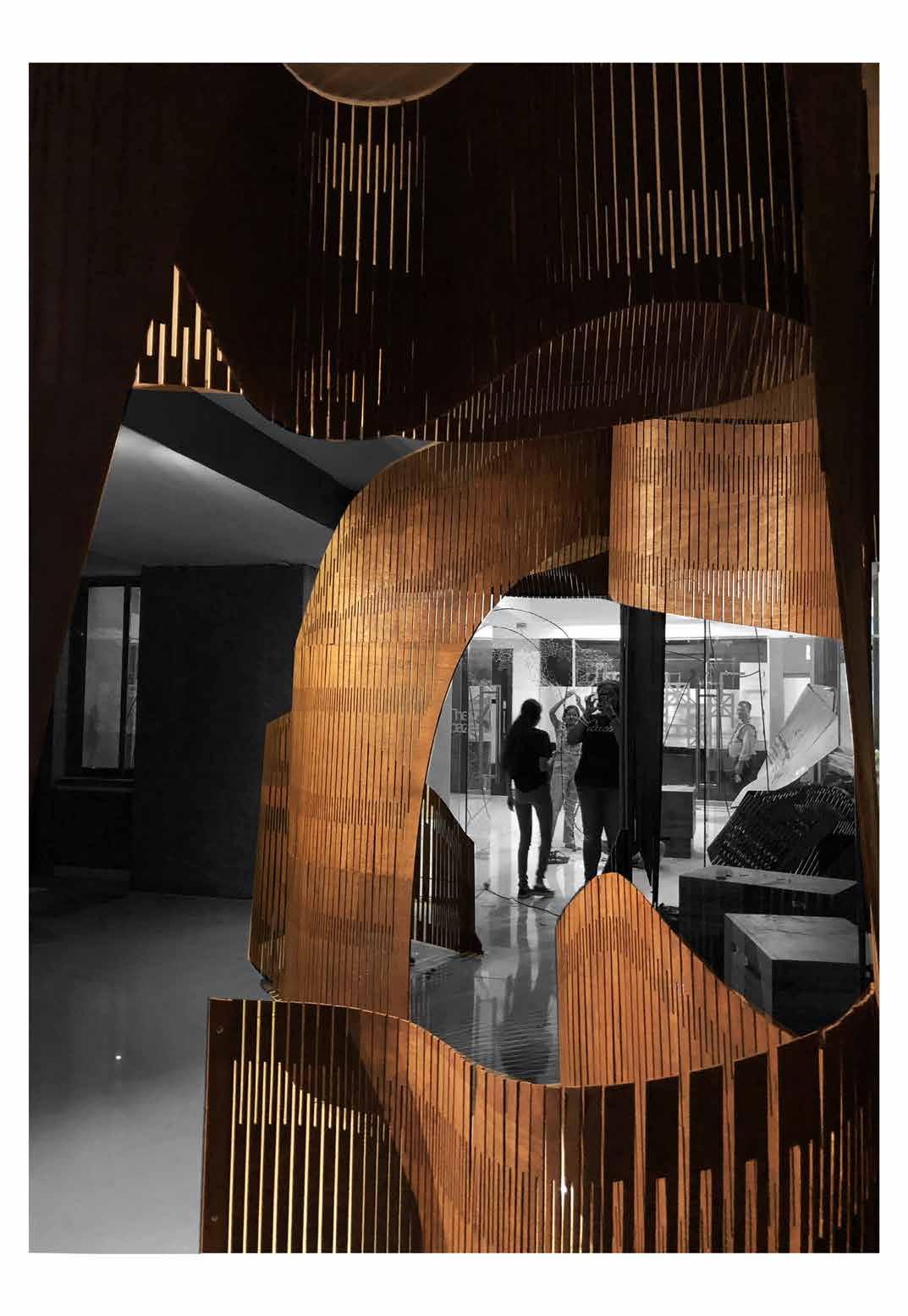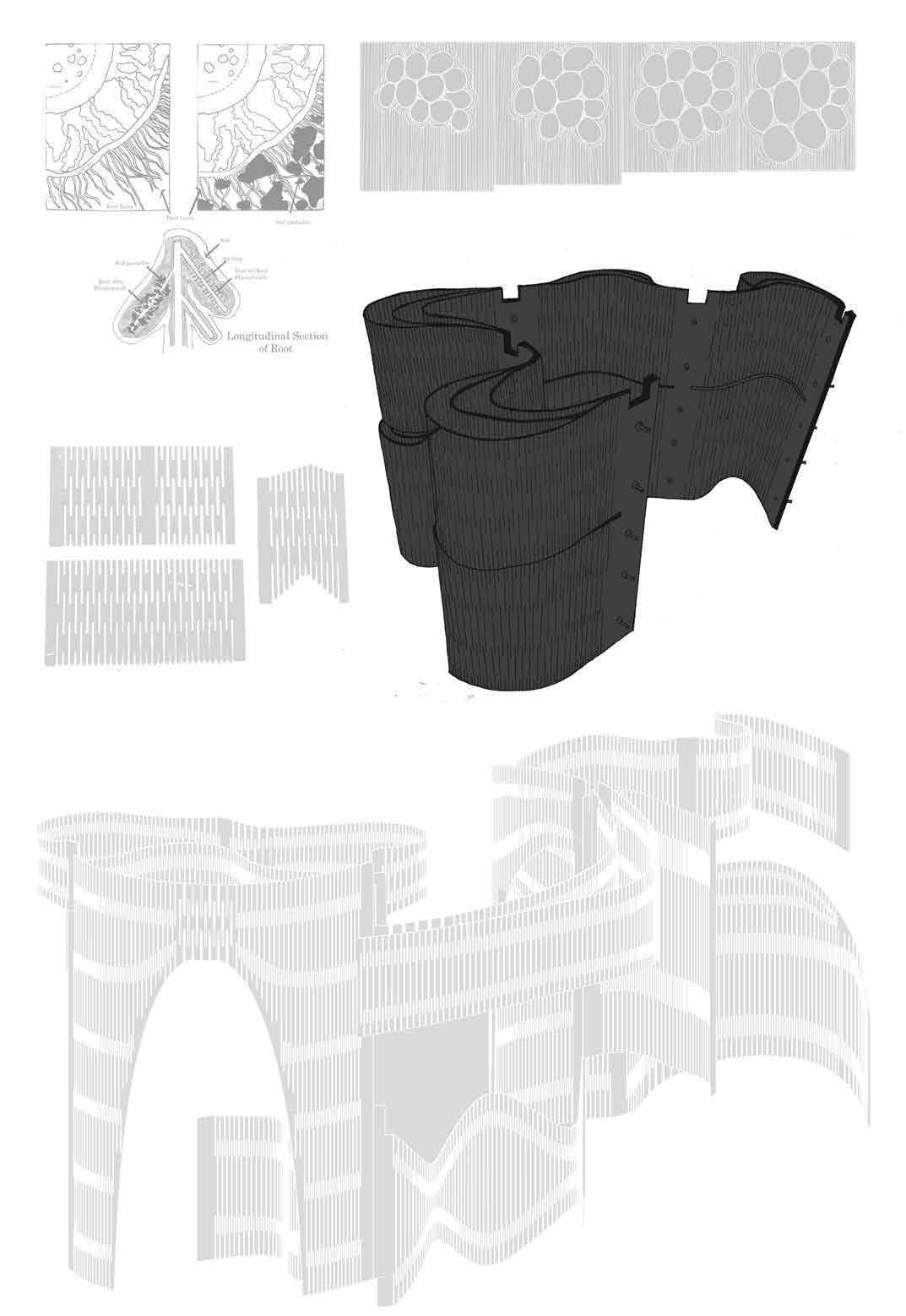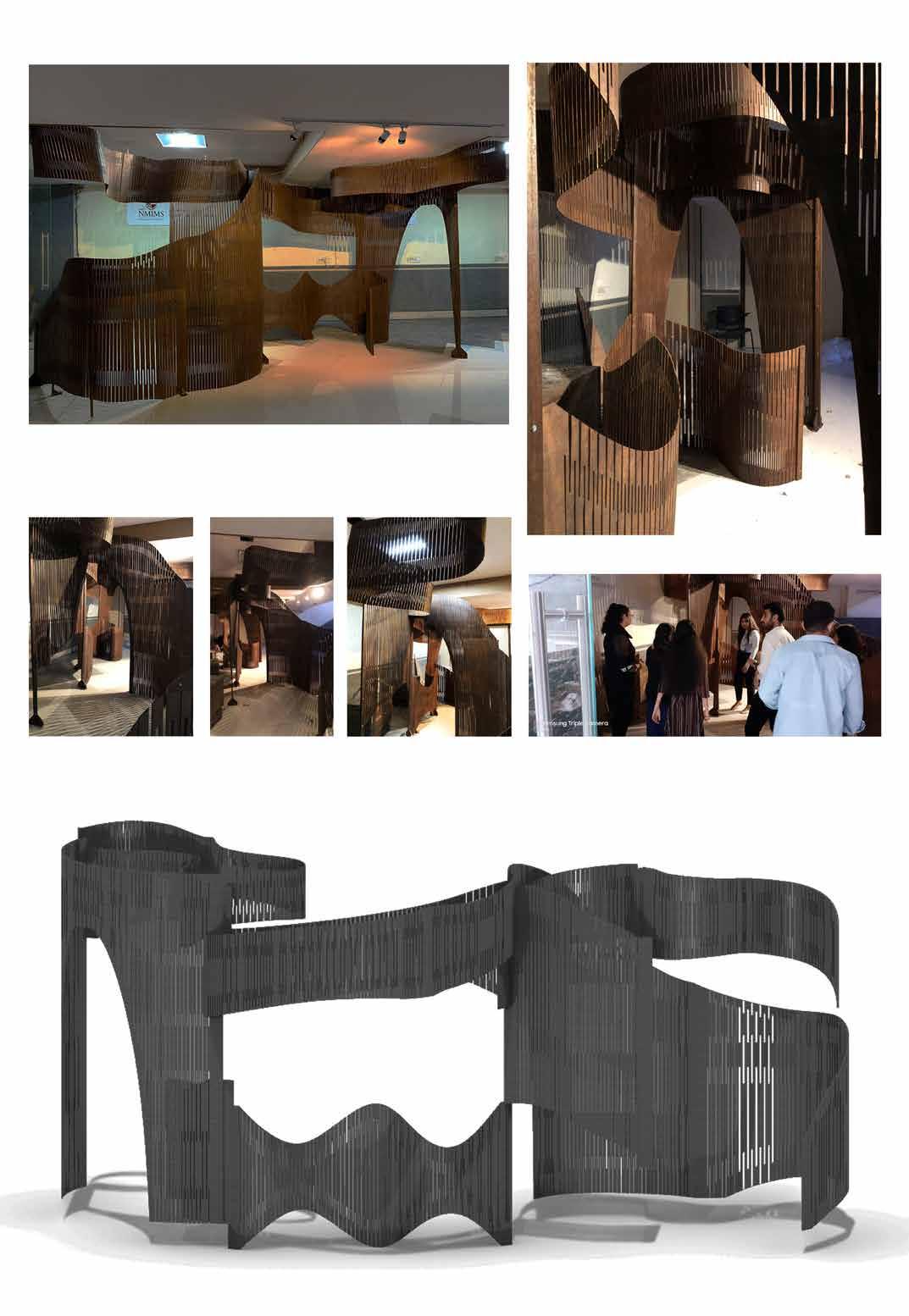The model itself is concentrated in terms of experience given its volumetric nature. The various segments show varied turgidity levels in the cactus cells through cuts and folds. When there is water loss due to change in pressure and the shrinking of cells and skin, accordion like fold and formed. The formation of the accordion like fold is shown in the segment as well. The flow of these segments indicate the smooth transition between the various stages of turgidity. Rearrangement of cells during the process is shown in the second segment, in form of an interactive space. The project is an architectural take on natural process.
