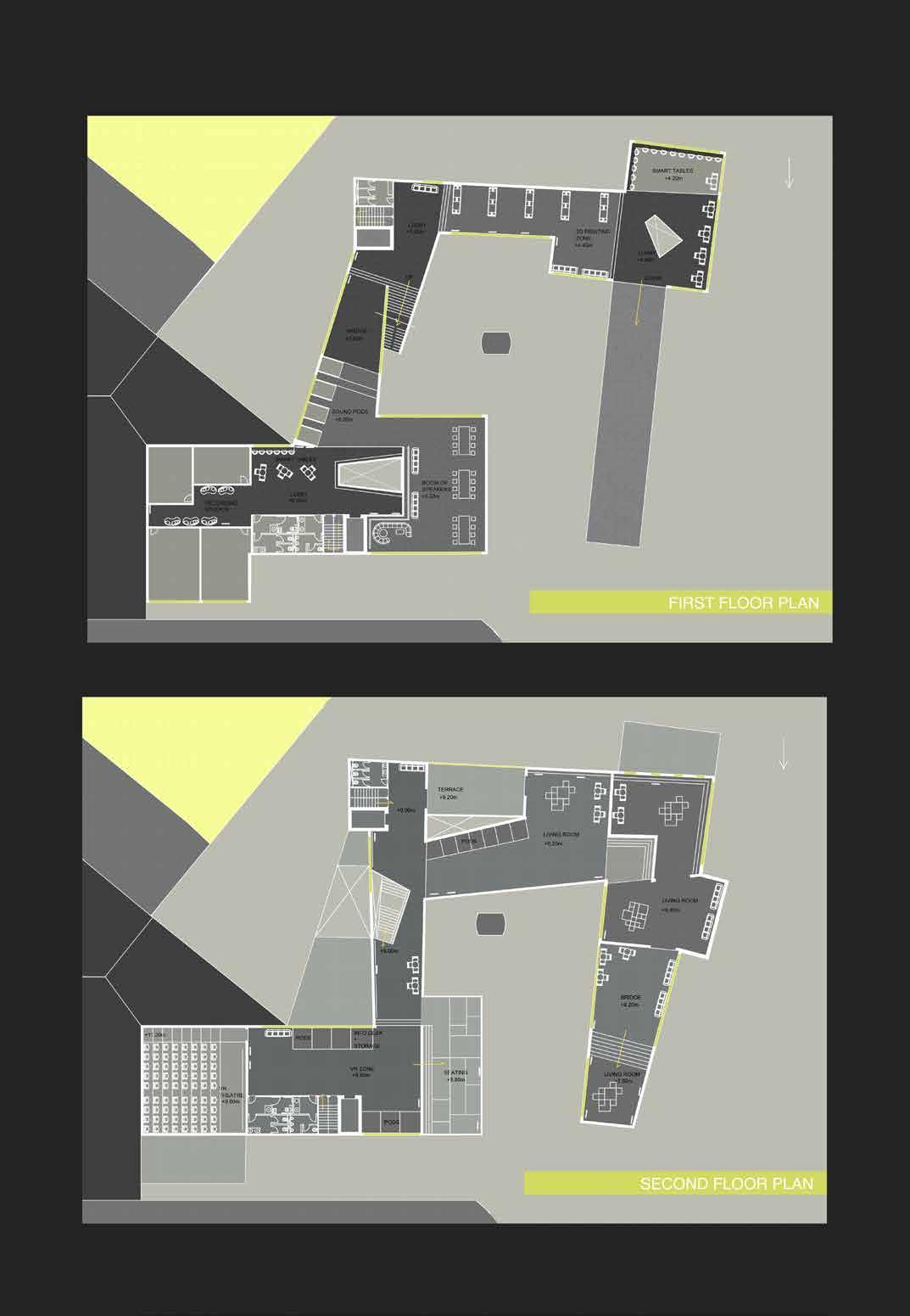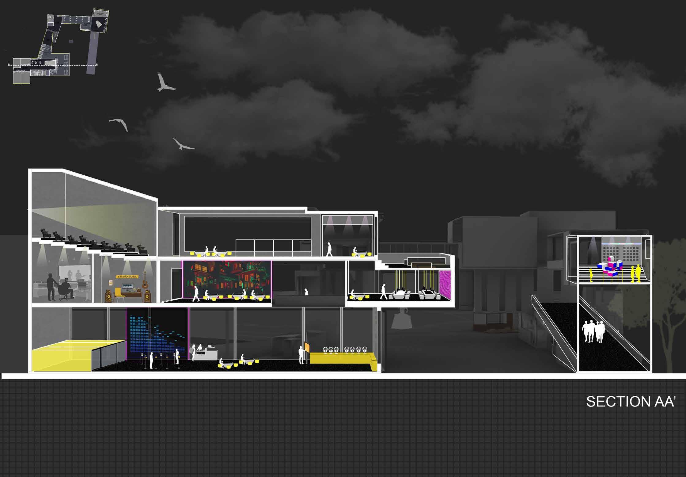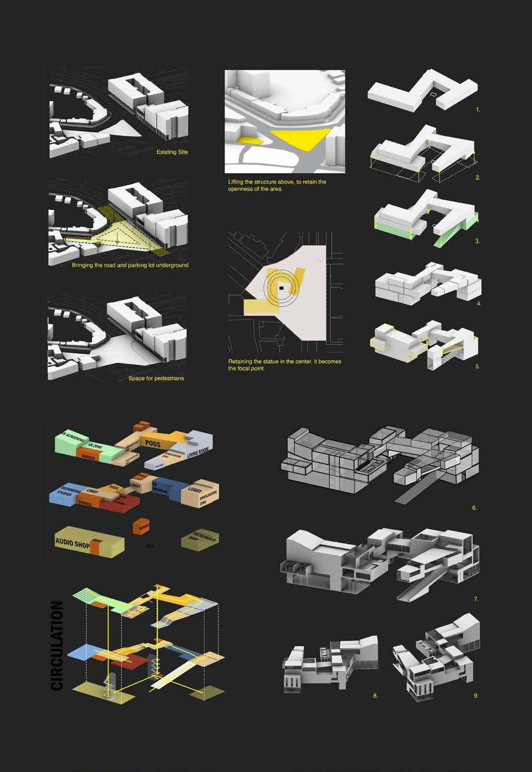 Rhythm house was one such store which sold vinyls and could not bare the wrath of revolution. Hence revamping it into a physical warehouse of Spotify, this project becomes consolidation of rethinking ways music can be percieved in today’s times. Innovative programmes like ‘The living room’ where strangers can sync music and identify common tastes are inserted, hence creating an important node in the city of Mumbai.