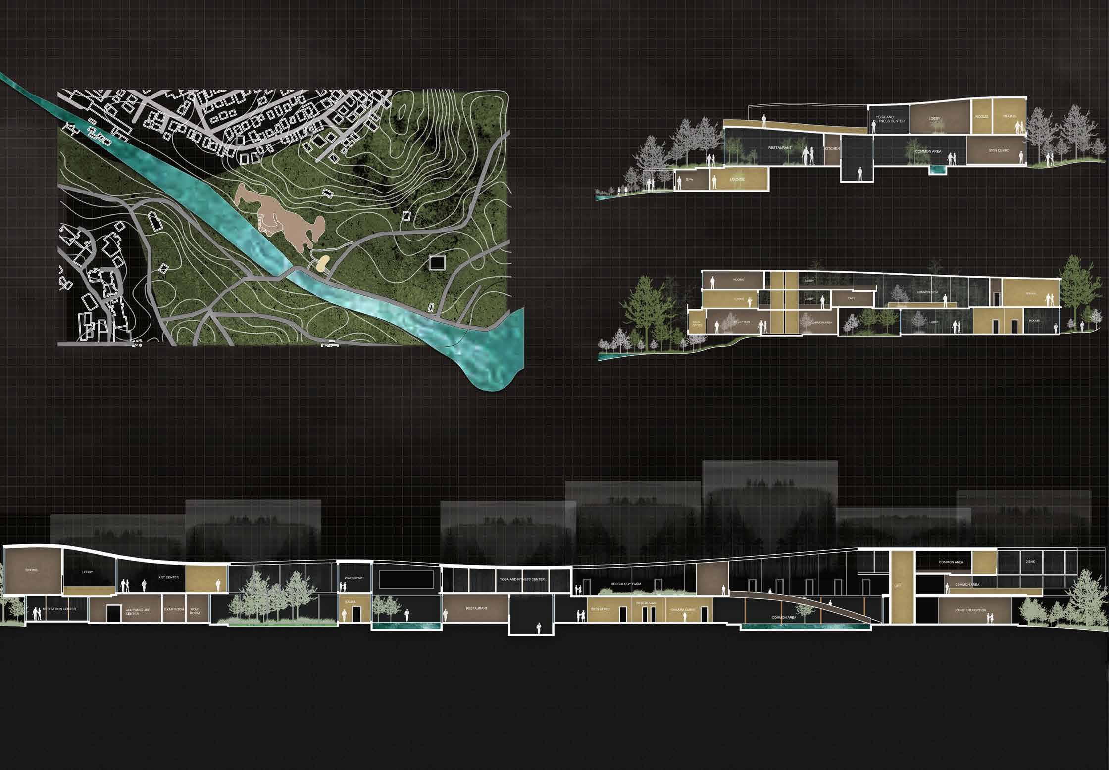 An attempt is made to introduce such a facility in the core of Mumbai, in its urban forest - the Sanjay Gandhi National Park, the site fits the programme perfectly as Mumbaikars can consider this facility as a getaway amidst the hustles and monotony of a city landscape. Inspired by the lagoons, mist and calmness of the forest, a similar vibe of zen is replicated in this hospice center situated by the Dahisar river on a contoured terrain, with views of the forests and hills.