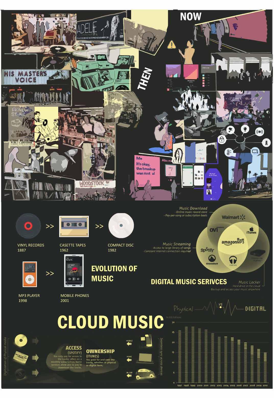 Over time, the way we percieve, listen and make music has changed. Earlier we used to have records, a certain sense of memory linked to those physical discs, right now those music holders are converted into cloud files, with everything being digital. Apps like Spotify have revolutionised the industry of music making, delivering and advertising.