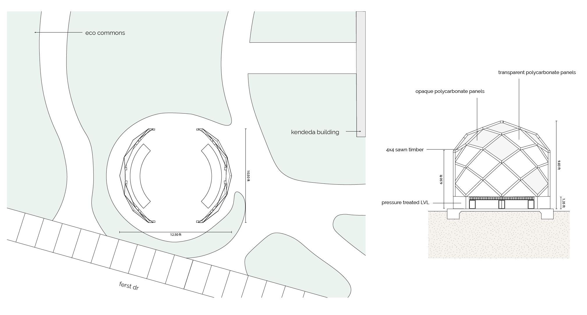 The bus shelter proposal is located in the Georgia Tech Eco Commons along Ferst Drive. It is designed as a wood frame geodesic dome, with openings along the north-south axis. The construction drawings detail the connection of the transparent and opaque polycarbonate panels to the frame, as well as the connection between the frame and ground.