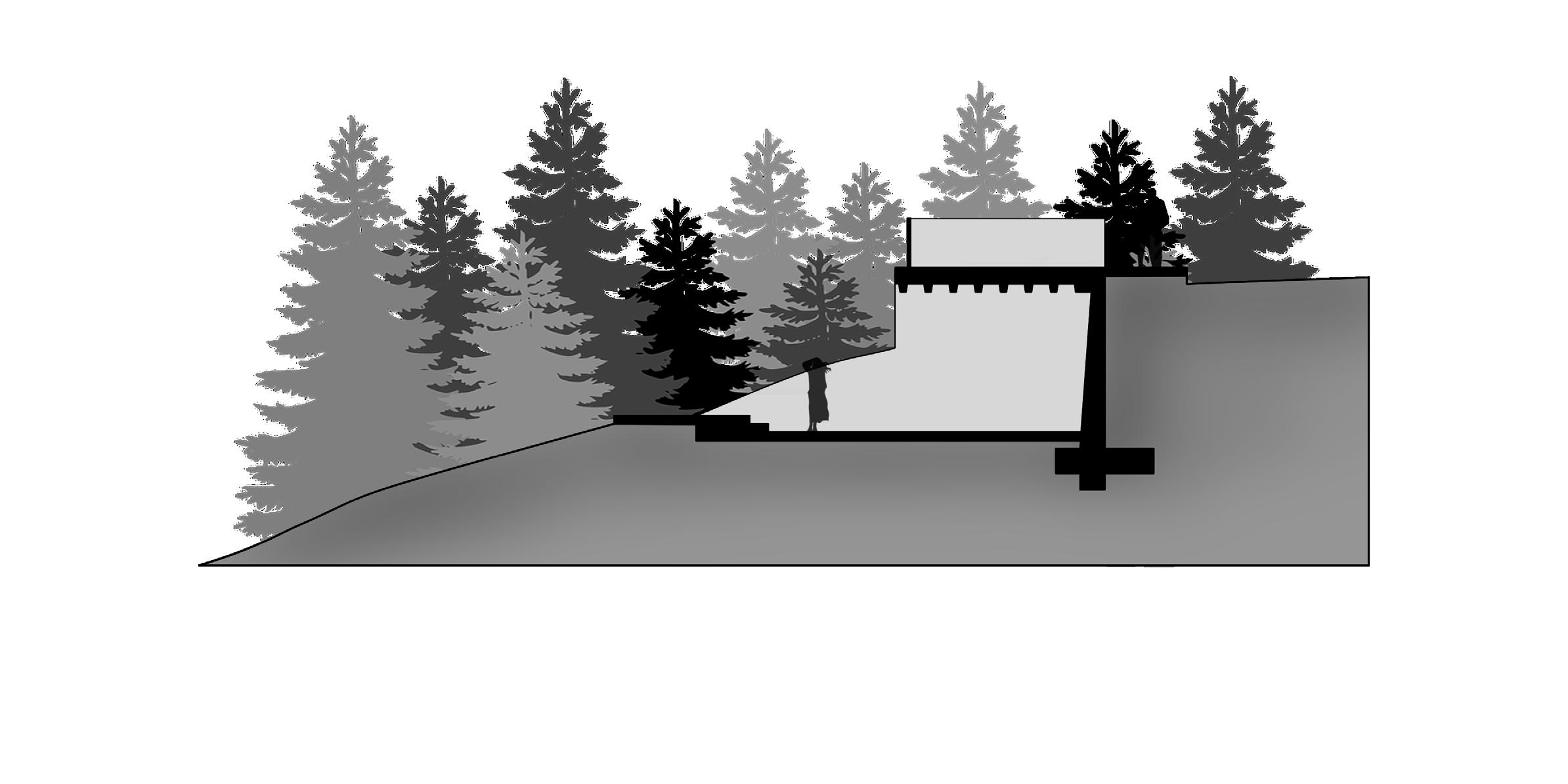 The concrete pavilion in a park was designed as a place of relaxation and observation. The two-way waffle slab roof provides a means of enclosure underneath and views above. The construction drawings detail the formwork design for the retaining walls and concrete roof.