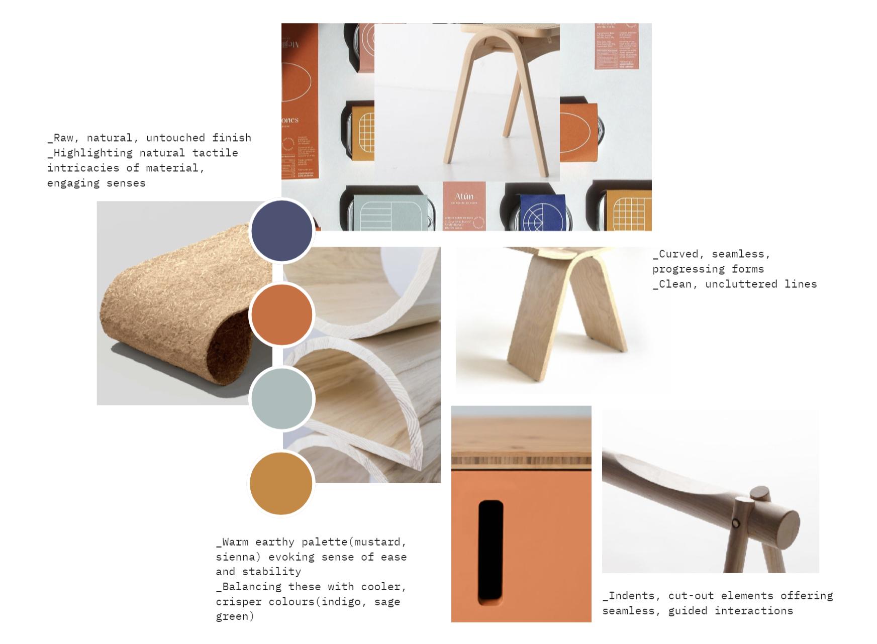 This CMF board is a curated showcase of the materials and finishes that define Bhava’s aesthetic and functional identity. It highlights the careful selection of colours, textures, and materials that harmonise to create a product that is not only visually appealing but also tactilely engaging. Each element—smooth, flowing curves and a blend of polished and rustic textures— illustrates the design’s emphasis on calm, balance, and seamless integration into everyday life. The board exemplifies the skilful application of CMF principles, demonstrating how thoughtful material choices elevate user experience and product functionality.
