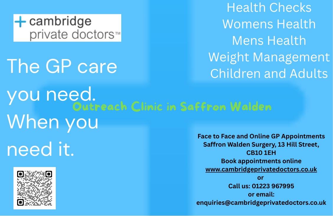 Cambridge Private Doctors provides personalised private GP care for families at our Saffron Walden outreach clinic, located at the chiropractic clinic on Hill’s Street. We’re available on Tuesdays, Fridays, and some Saturdays, with same-day appointments. Our wider practice offers a six-day service with easy online booking and phone, video, and face-to-face consultations.