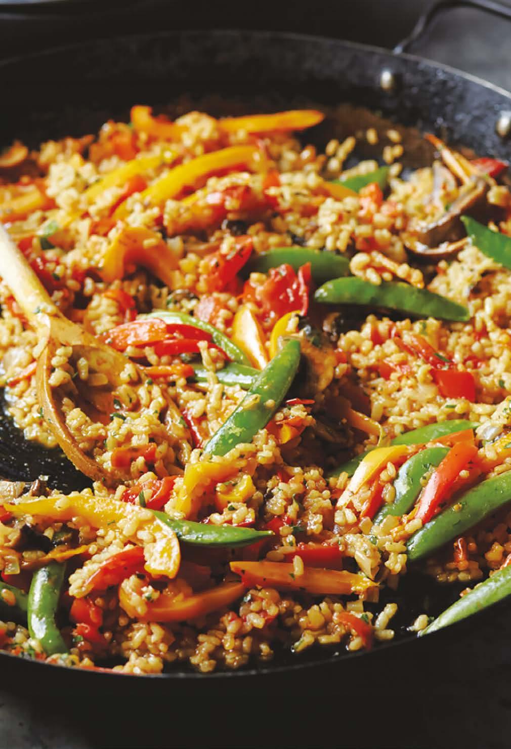 A vegetarian adaptation of the traditional Spanish dish, paella rice is readily available but use short-grain brown or Arborio if you can’t find it. Saffron threads give the dish its unique flavour.