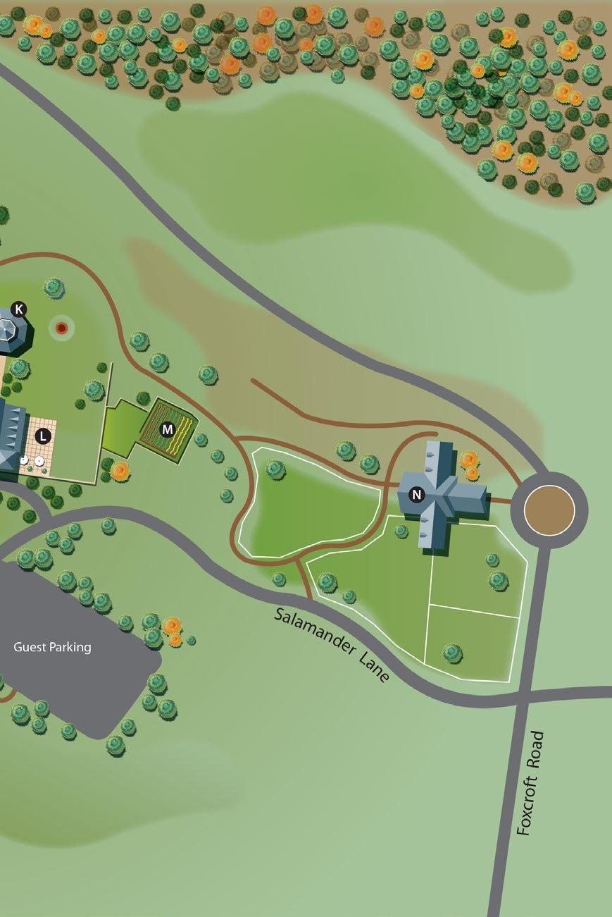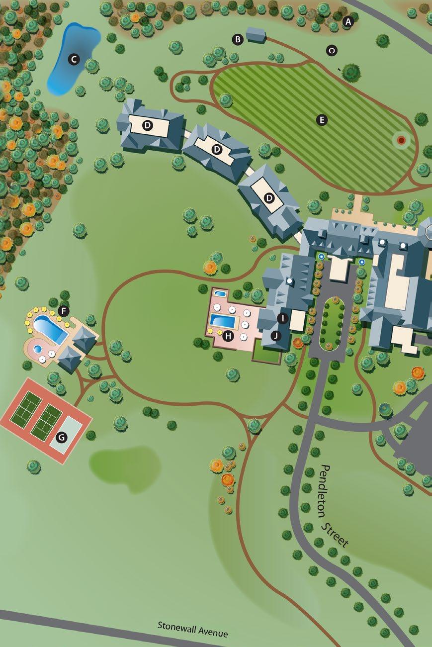 A Walking & Riding Trails B Stallion Barn C Fishing Pond D Guest Accommodations E Grand Lawn F Family Pool (seasonal) G Tennis & Sport Courts H Spa Pool I Spa & Wellness Center - main level J Fitness Center & Indoor Poollower level K Harrimans Grill L Middleburg Terrace M Culinary Gardens N Equestrian Center O Empower Adventures Activity Pick Up Fire Pits Market Salamander located at 200 W. Washington Street, 0.7 miles