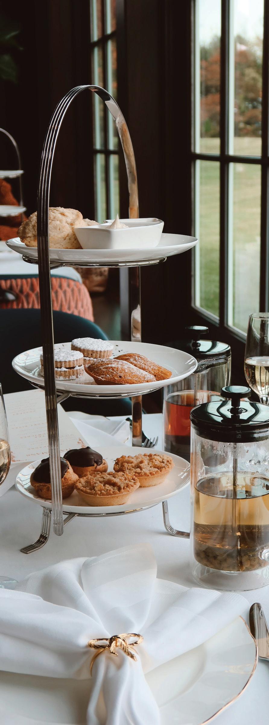 Enjoy a classic afternoon tea experience set against sweeping views of the Virginia countryside. Guests are invited to savor a curated selection of organic teas, traditional tea sandwiches, petit fours, and refined accompaniments, thoughtfully paired with a glass of Laurent-Perrier Champagne.