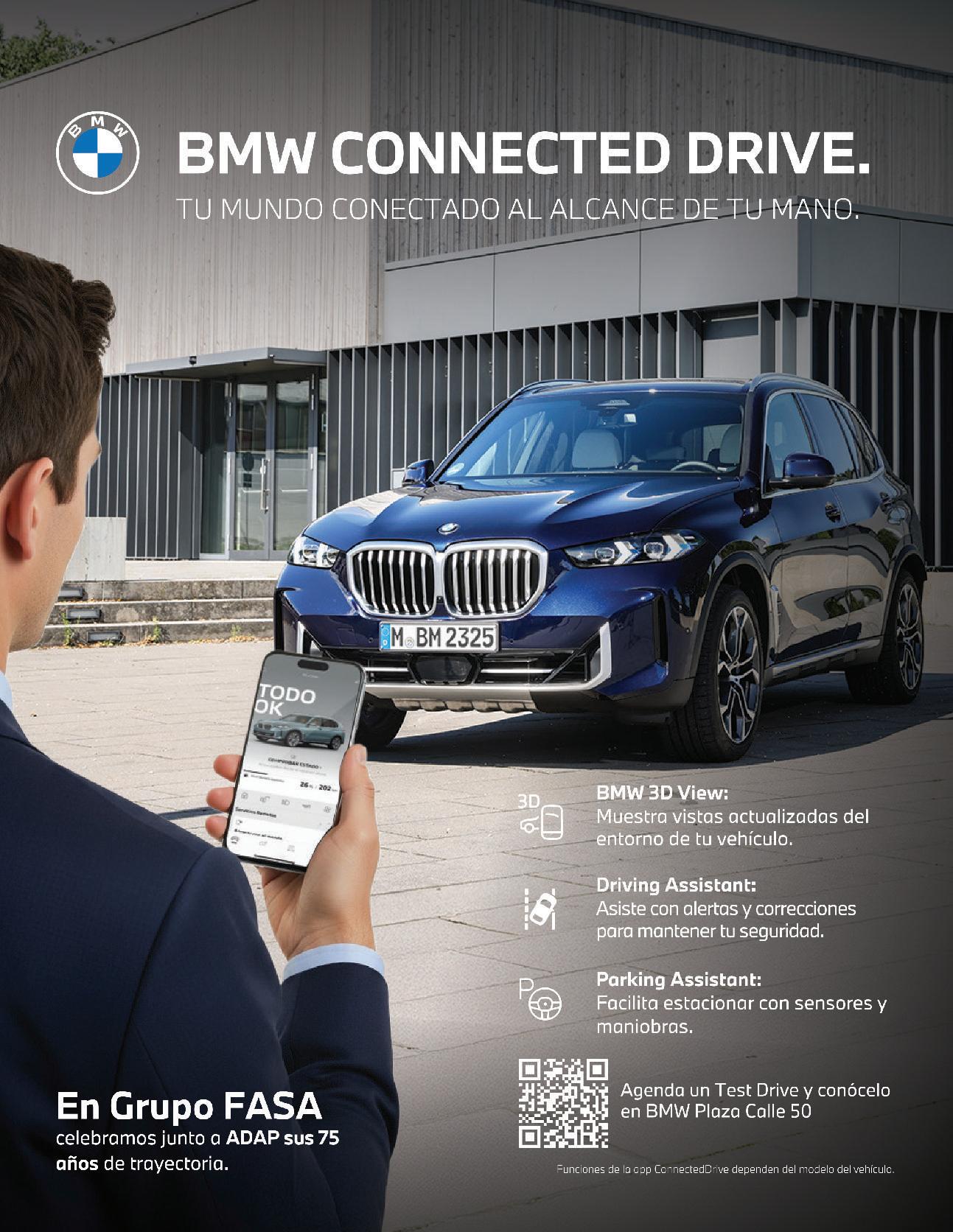 Las funciones disponibles pueden variar según el modelo del vehículo, pero todas comparten un mismo objetivo: hacer que tu experiencia de manejo sea más intui tiva, eficiente y personalizada. Con BMW ConnectedDrive, no solo conduces un auto: interactúas con una tecnología que piensa contigo.