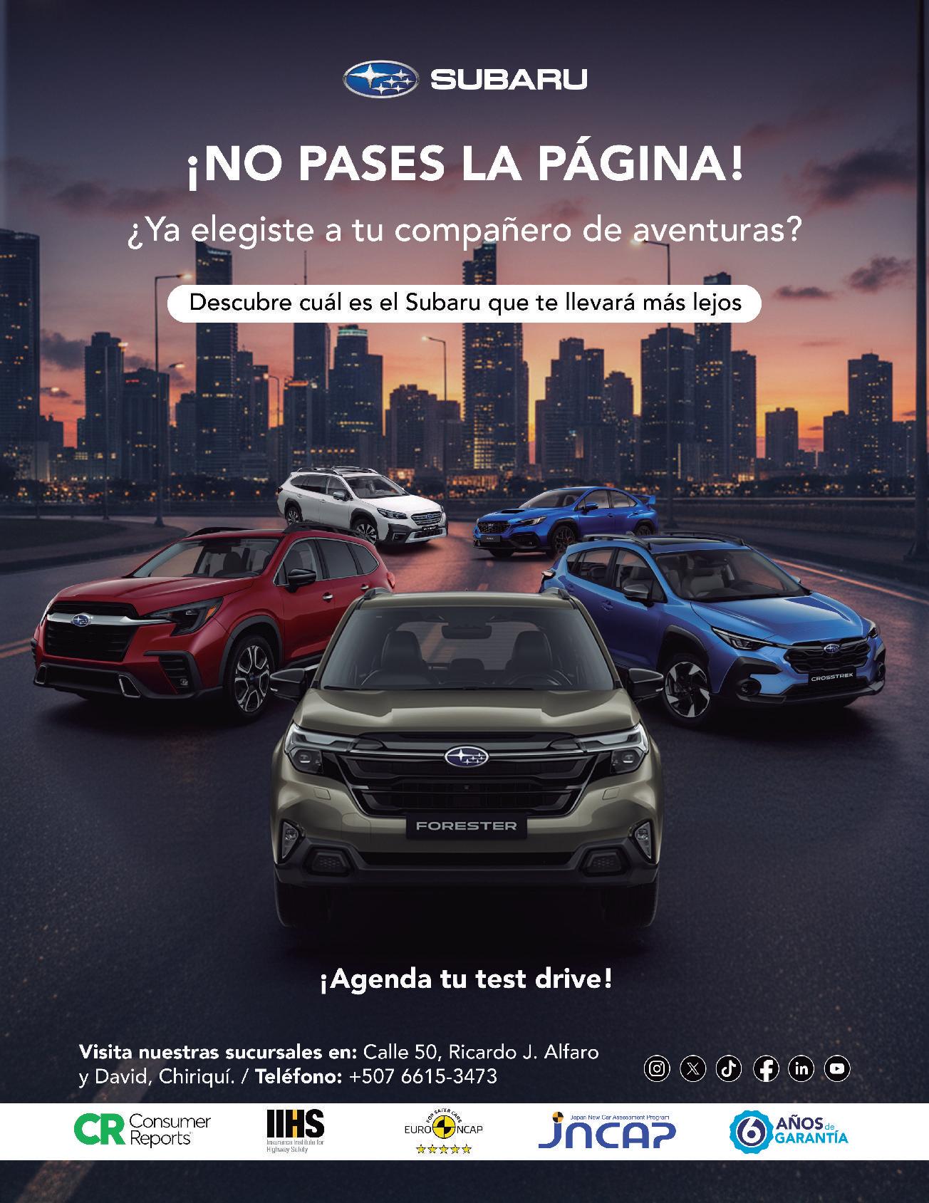 No es solo un vehículo: es parte de nuestro legado. Quienes forman parte de nuestra comunidad, los verdaderos “subaristas”, nos acompañan a lo largo de los años, fieles no solo al producto, sino también a la experiencia y al cuidado que compartimos con ellos. Los hacemos parte de nuestra familia, acompañándolos en cada viaje, protegiendo lo que más valoran y creando recuerdos que duran toda la vida. Al mismo tiempo, nos mantenemos cercanos a la gente y a la sociedad panameña, construyendo vínculos que van más allá de los vehículos.