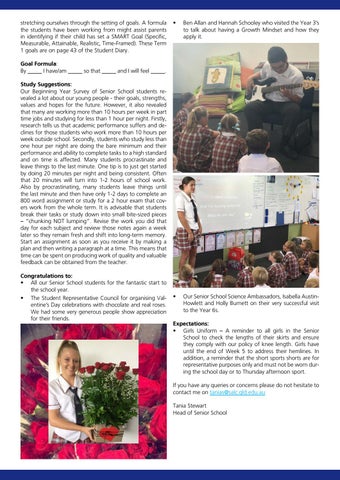 stretching ourselves through the setting of goals. A formula the students have been working from might assist parents in identifying if their child has set a SMART Goal (Specific, Measurable, Attainable, Realistic, Time-Framed). These Term 1 goals are on page 43 of the Student Diary.