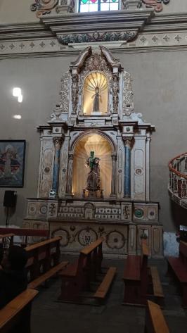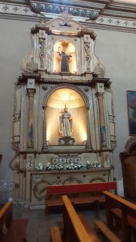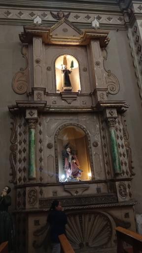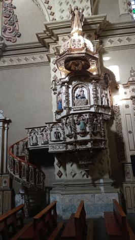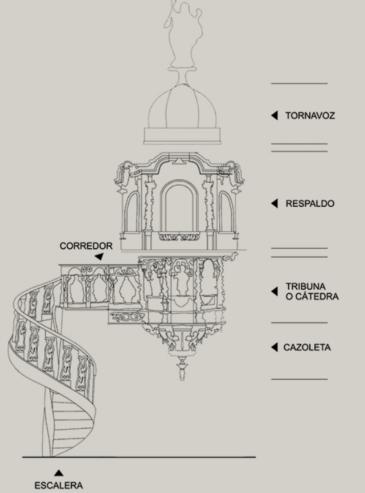 Se compone por escalera, tribuna, respaldo y torna voz. Los que estan representados son Santa Catalina de Siena, San Buenaventura, Santa Cruz. La imagen del niño Jesus, tambien a San Joaqui y Santa Ana