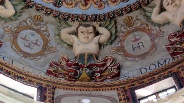 Además, contiene 8 angeles de alto con los brazos en alto y con alas en la espalda en en alto relieve que sostienen a la celeste con follaje, estrellas y queruvines.