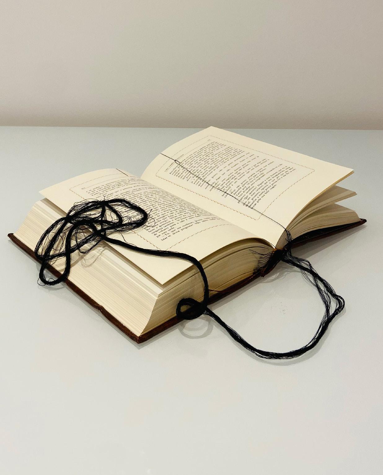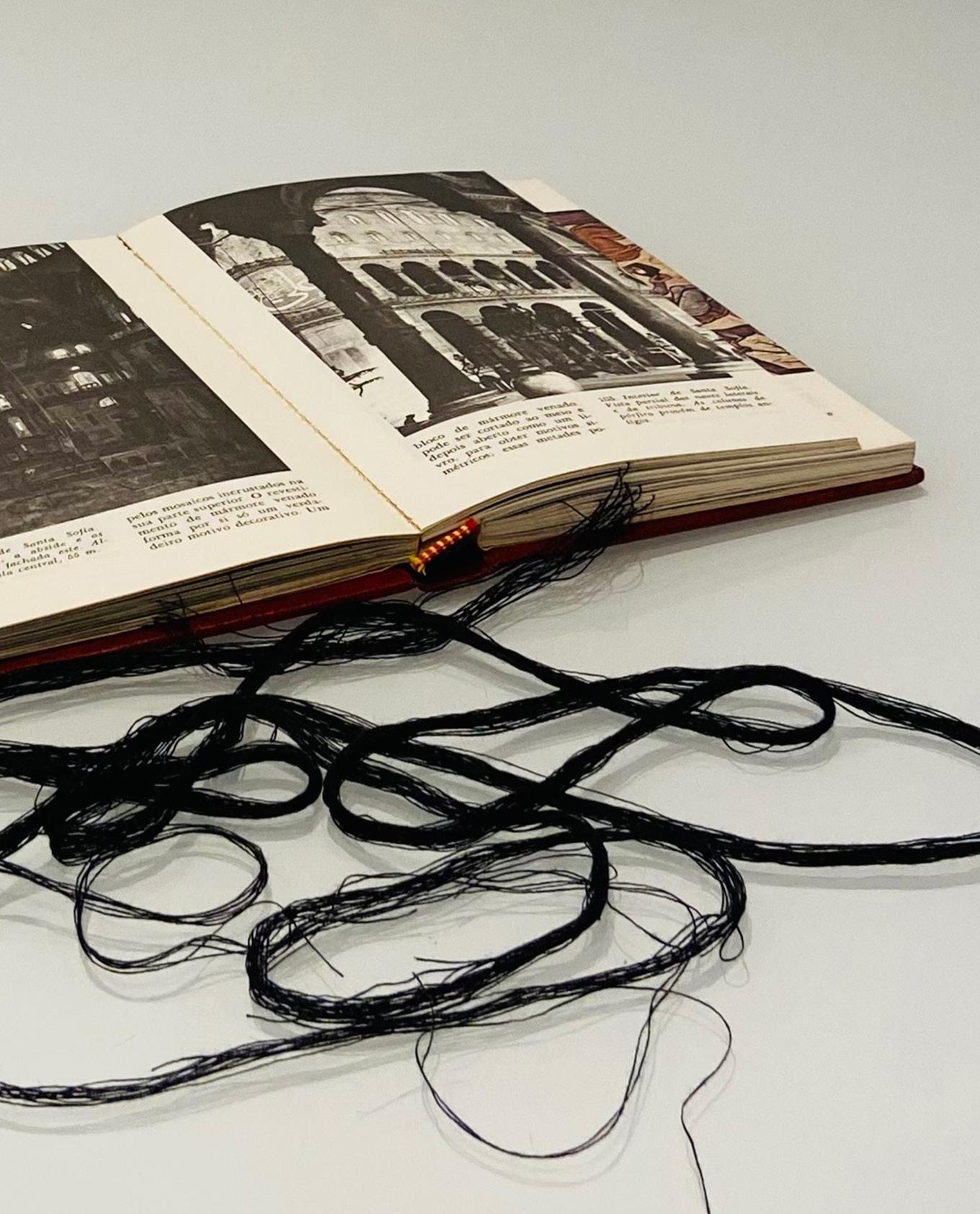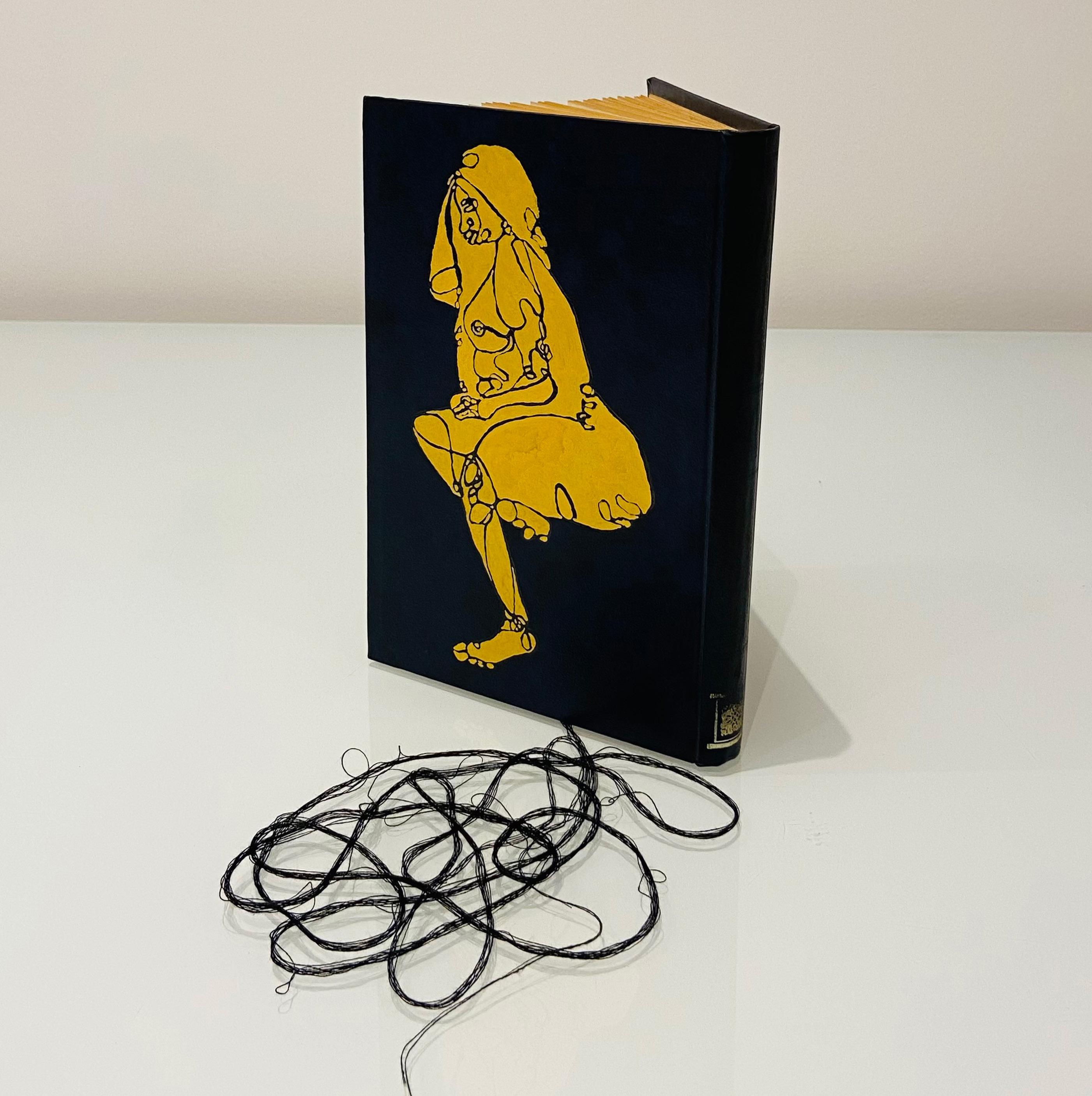 Sofia Saleme, “O riscar da cicatriz” 7, 2023, livro, pó de ouro, tinta da china e linha de costura, aproximadamente 20 x 15 x 4 cm