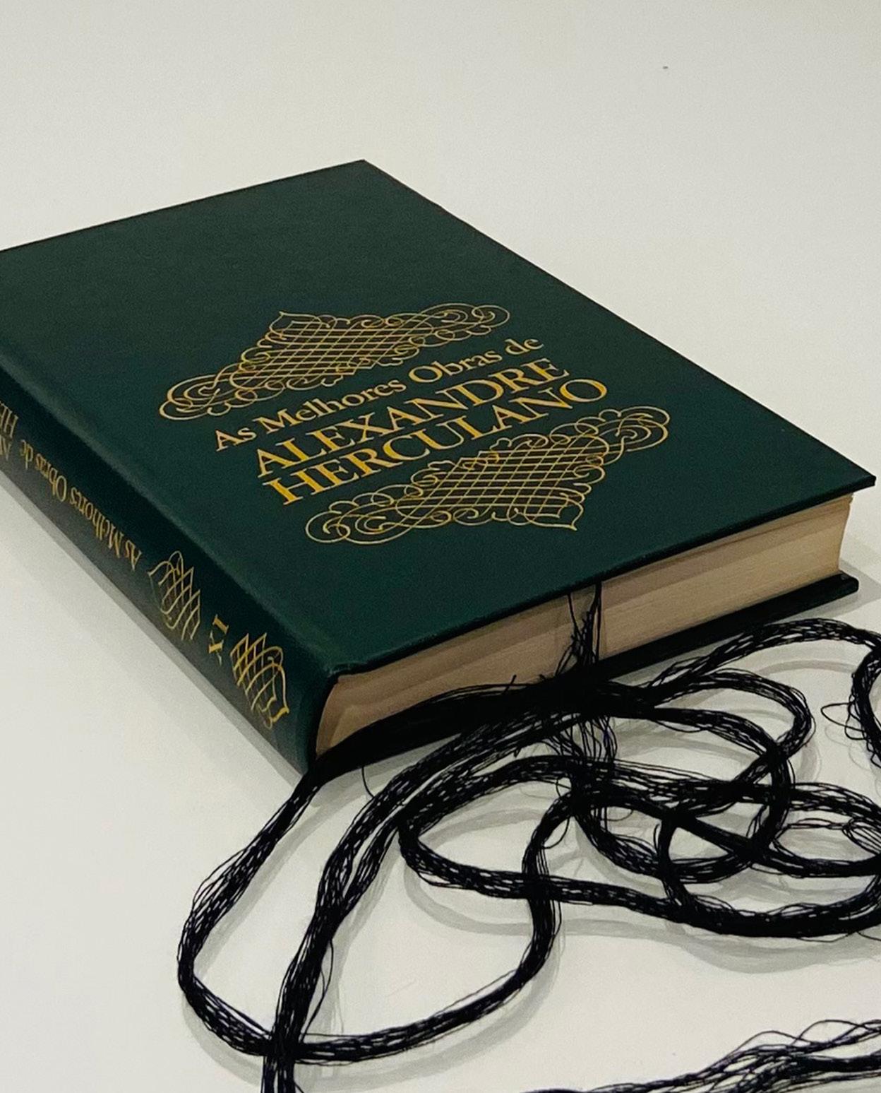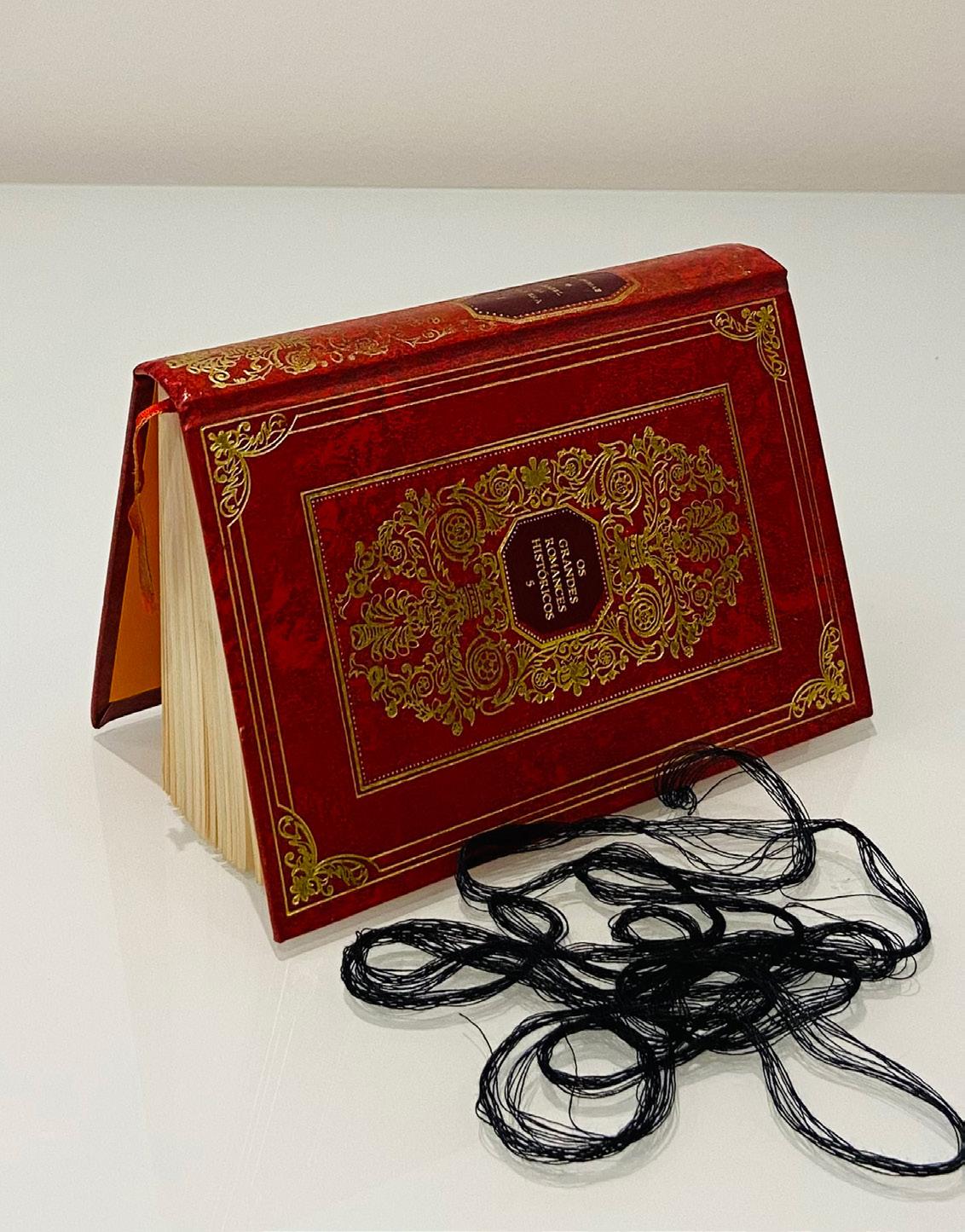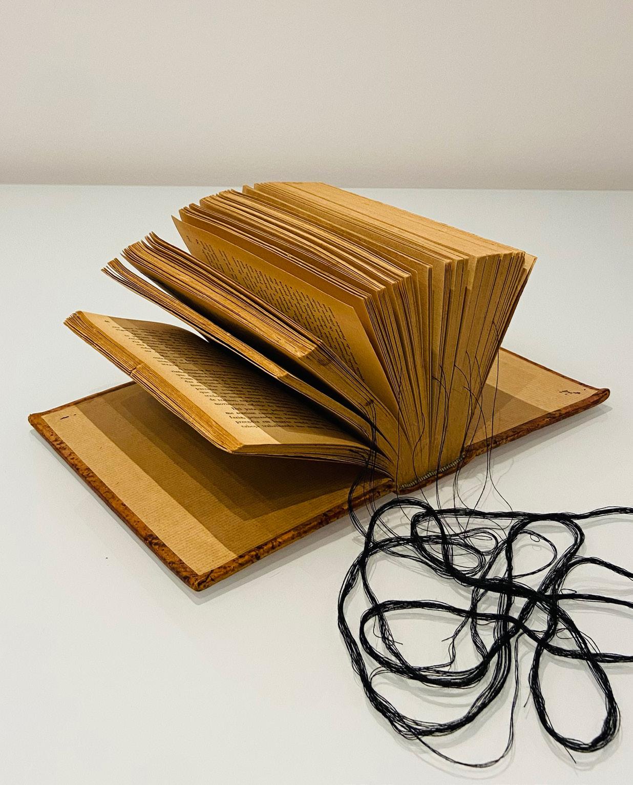 Sofia Saleme, “O riscar da cicatriz” 7, 2023, livro, pó de ouro, tinta da china e linha de costura, aproximadamente 20 x 15 x 4 cm