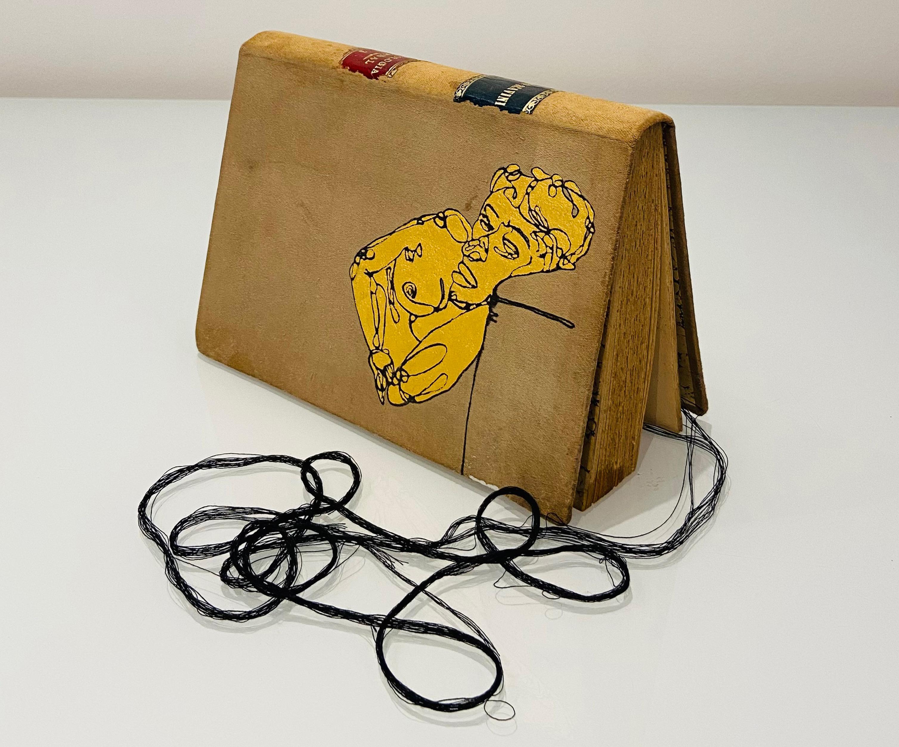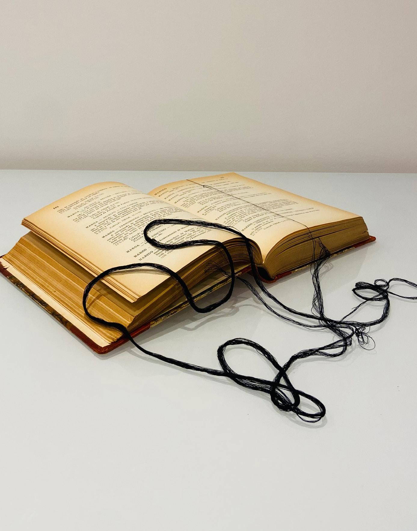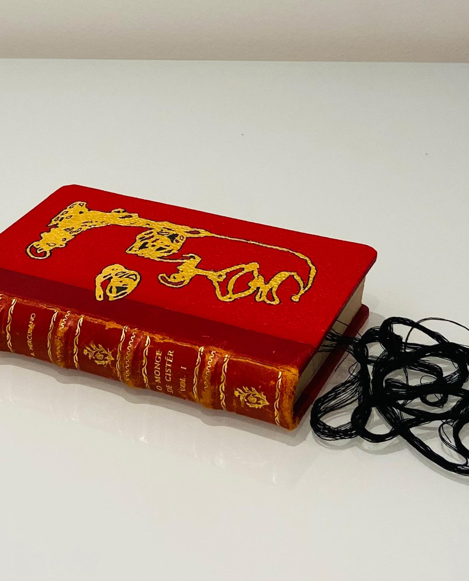 Sofia Saleme, “O riscar da cicatriz” 1, 2023, livro, pó de ouro, tinta da china e linha de costura, aproximadamente 20 x 15 x 4 cm