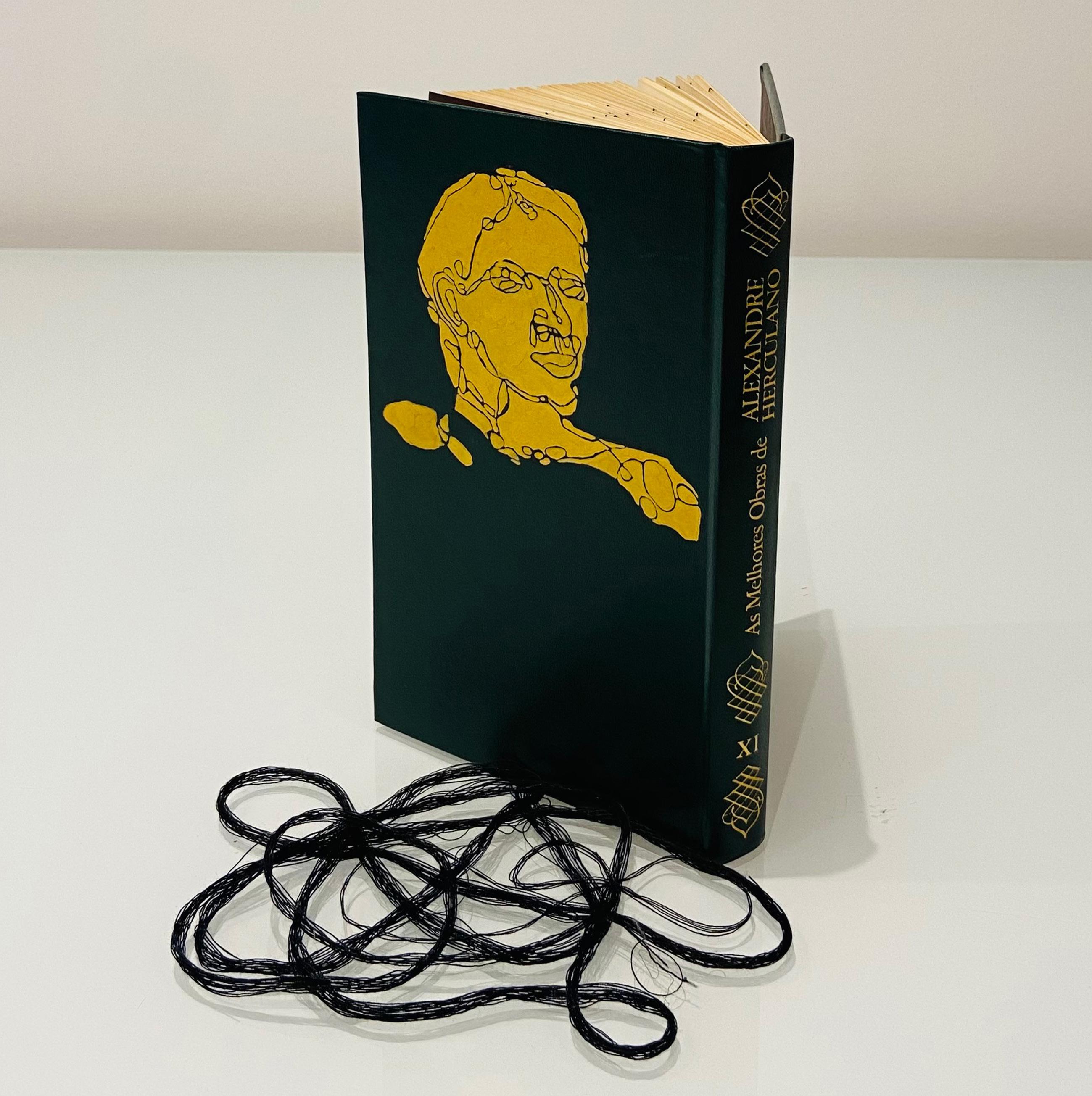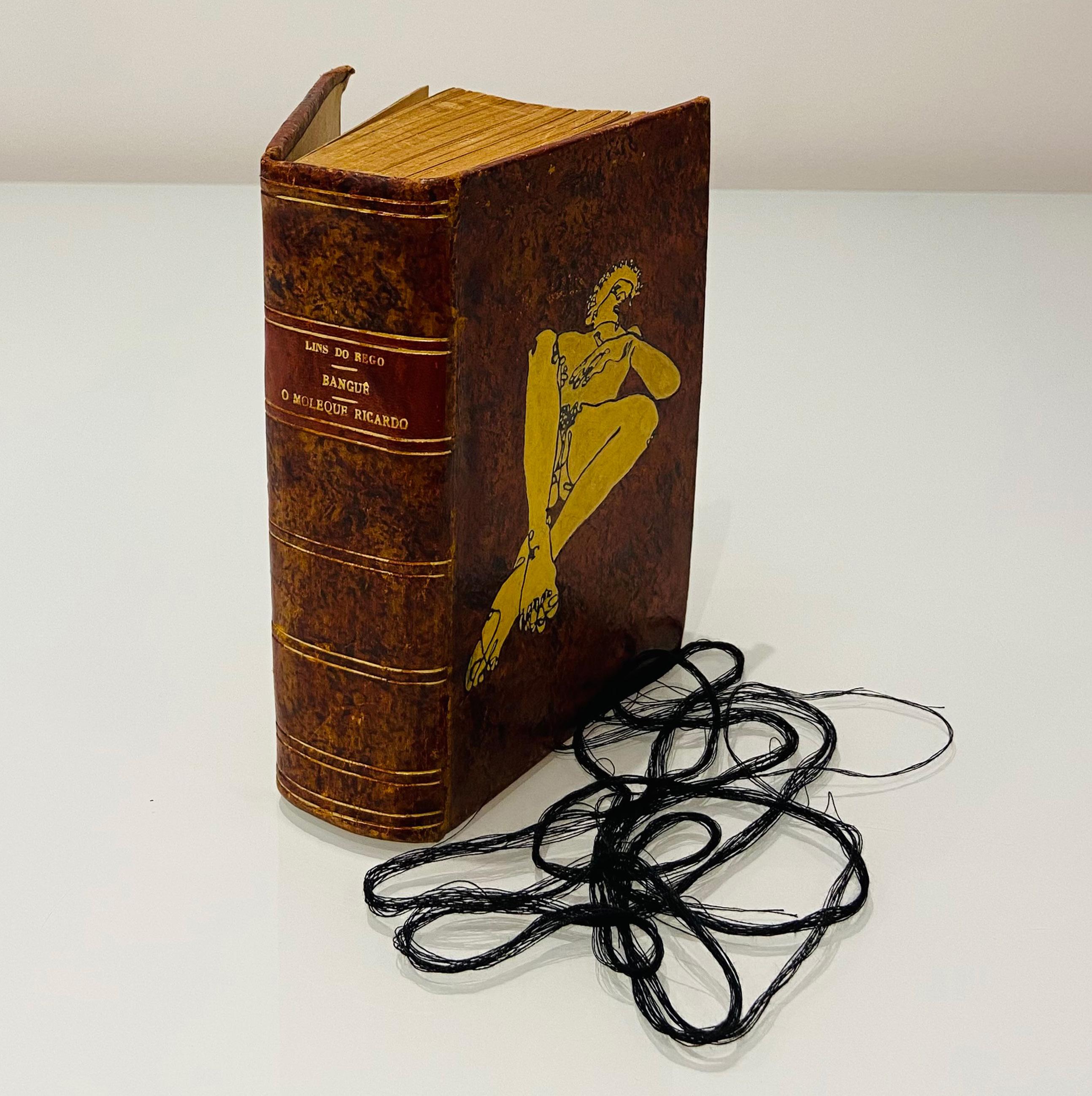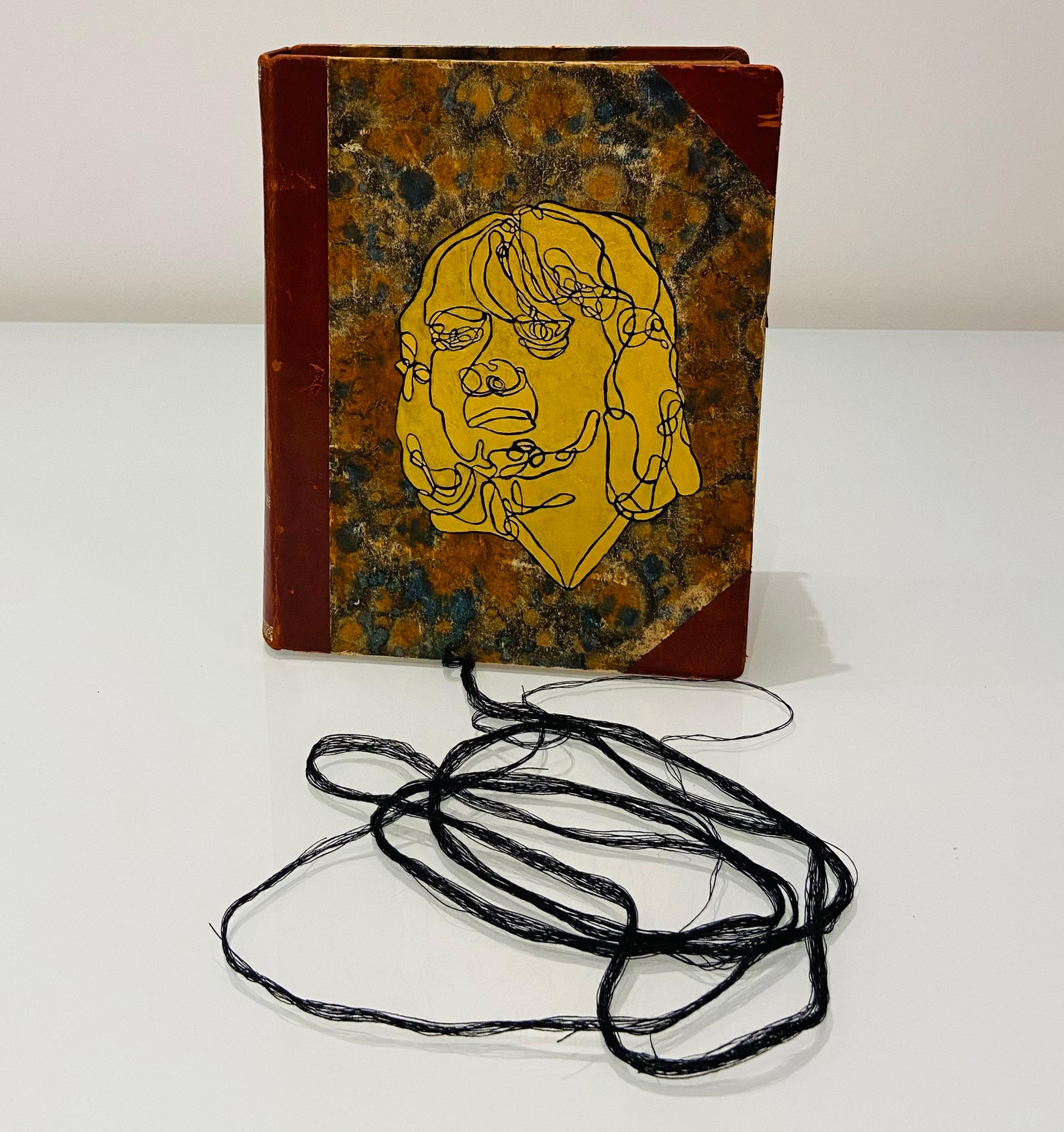 Sofia Saleme, “O riscar da cicatriz” 1, 2023, livro, pó de ouro, tinta da china e linha de costura, aproximadamente 20 x 15 x 4 cm