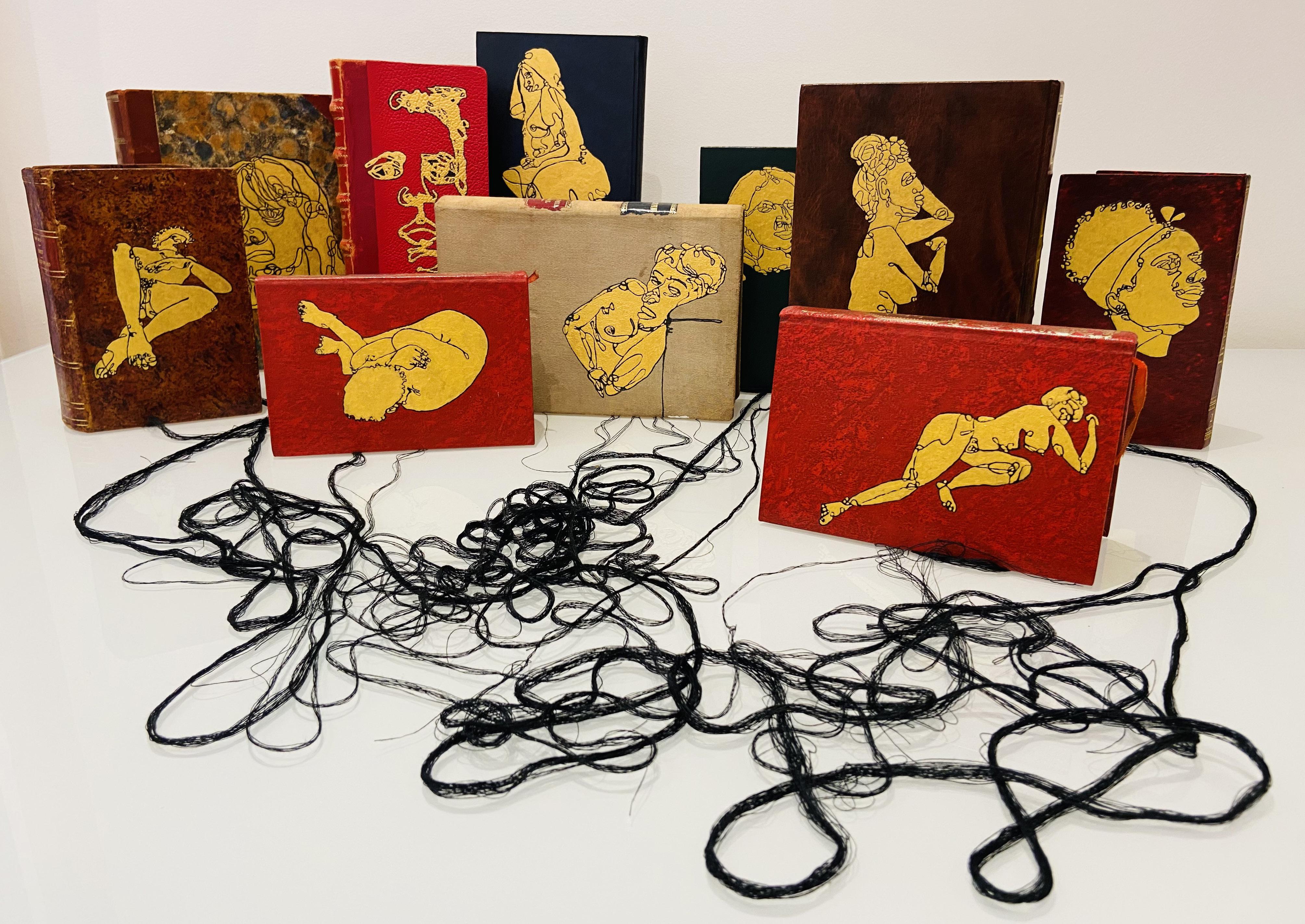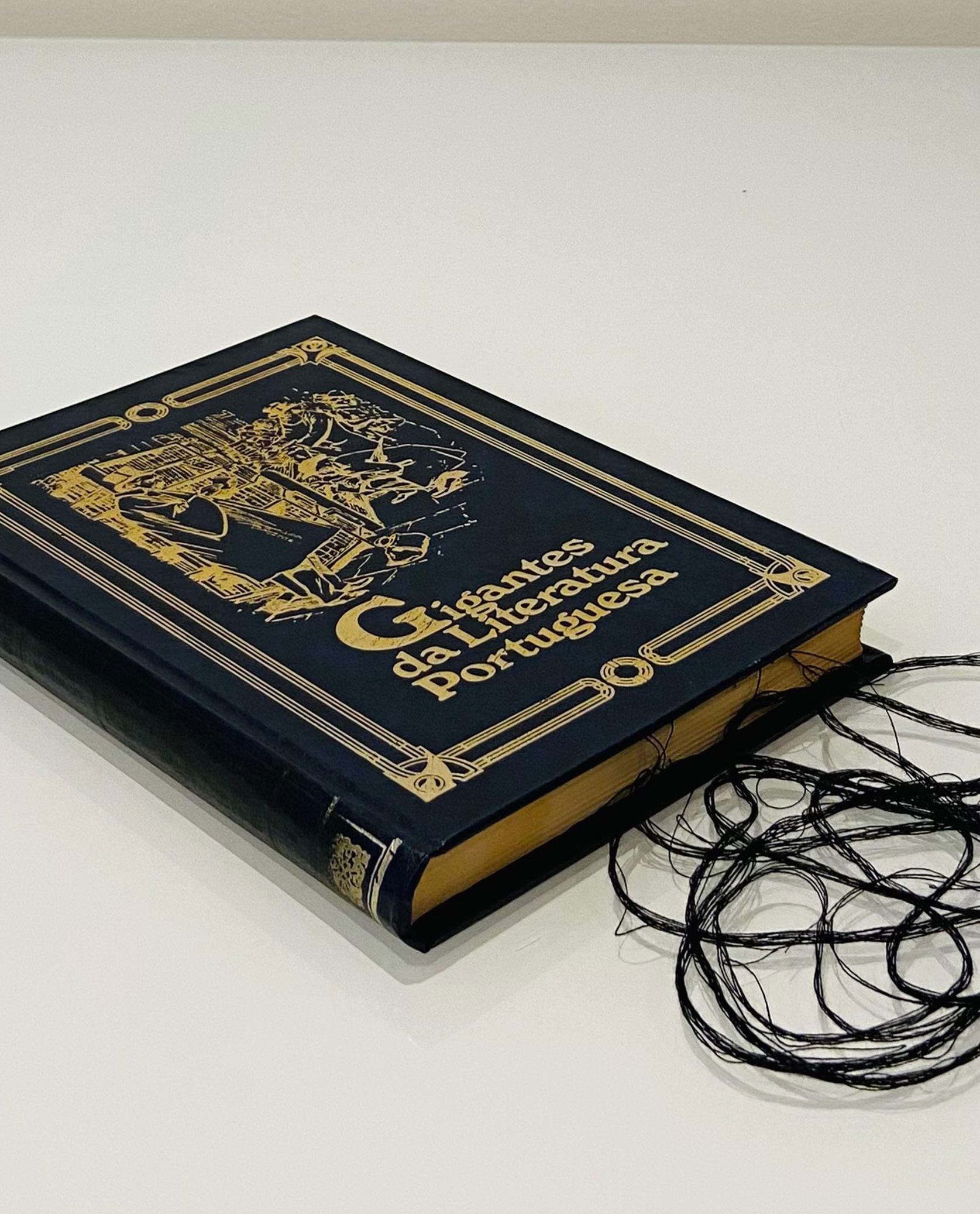 Minha principal ferramenta é o desenho e a linha e com eles, mergulho nas entranhas do corpo e social. Na série mais recente, intitulada “O riscar da cicatriz” observei, desenhei e escutei mulheres que cruzaram meu caminho nos primeiros meses como imigrante em Lisboa. “Todo o risco é muito importante. A pressão, o riscar, tem também a ver com o ferir”, escreveu a artista portuguesa Paula Rego. O desenho é aqui uma ferida, nas capas e contracapas de livros escritos por homens de lingua portuguesa. Livros que foram lidos, venerados, relidos e, por fim, esquecidos nas prateleiras de lojas de livros usados. Me apropriei de exemplares da história da arte, de gigantes da literatura portuguesa, livros sobre justiça e moralidade e neles desenhei mulheres com seus corpos, curvas, sexualidades, dúvidas, desejos e vontades. O pó de ouro as enaltece. Mas ele também fala de mais uma cicatriz: uma dívida e uma reparação. Uma ferida colonial.