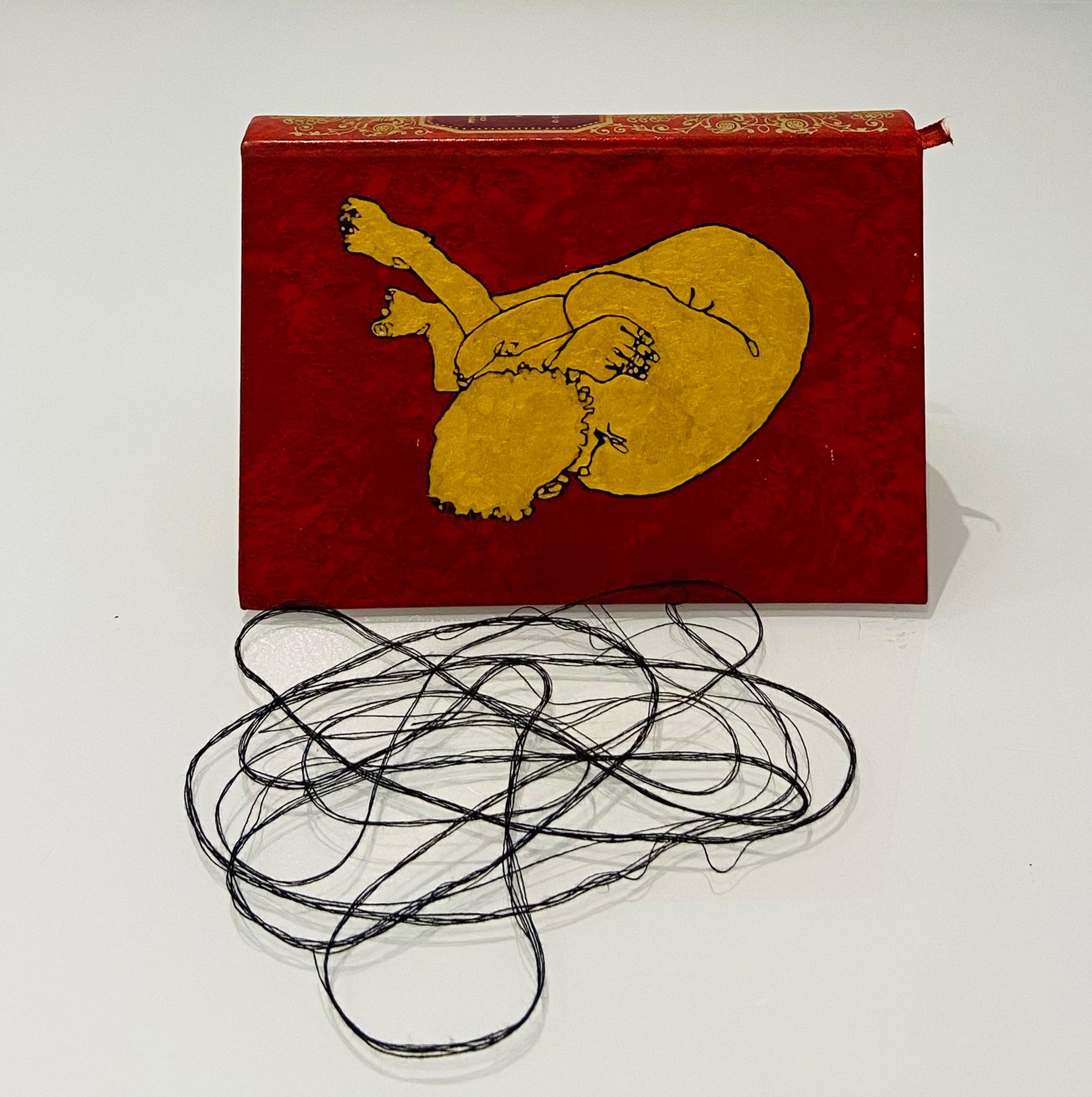 Sofia Saleme, “O riscar da cicatriz” 9, 2023, livro, pó de ouro, tinta da china e linha de costura, aproximadamente 20 x 15 x 4 cm