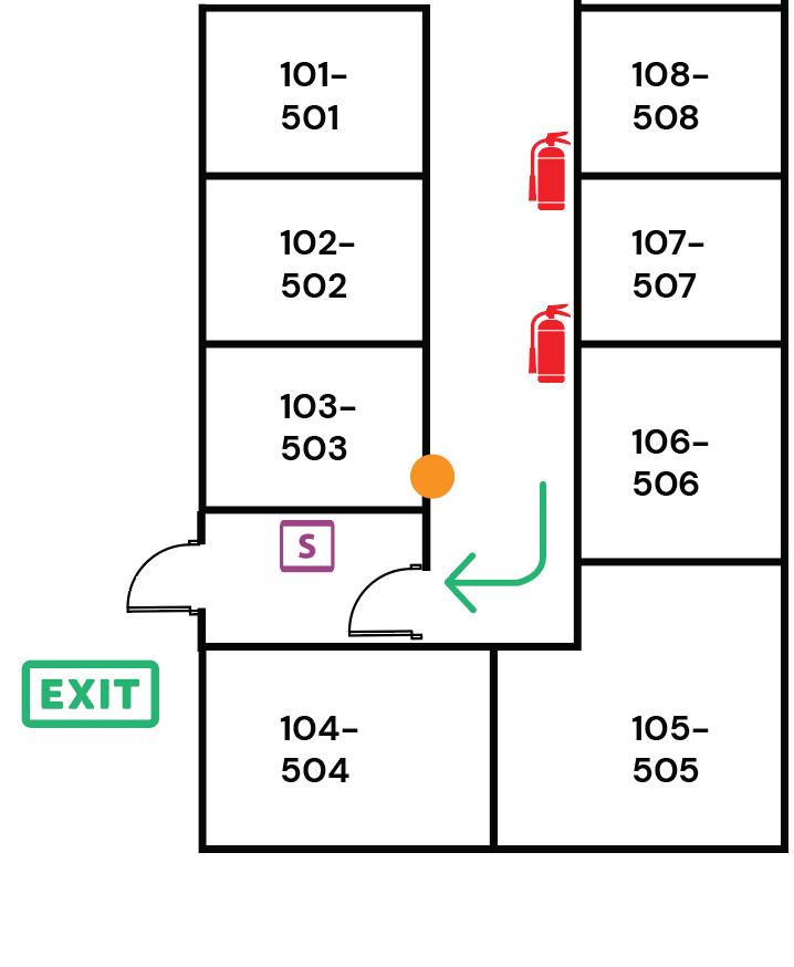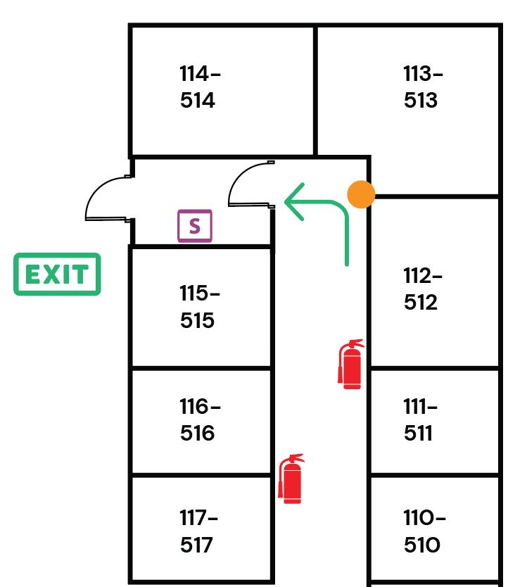 This map shows the locations of fire extinguishers and pull alarms and indicates evacuation routes in your building. In the event of a fire, choose the safest evacuation route based on your location and the fire’s spread.