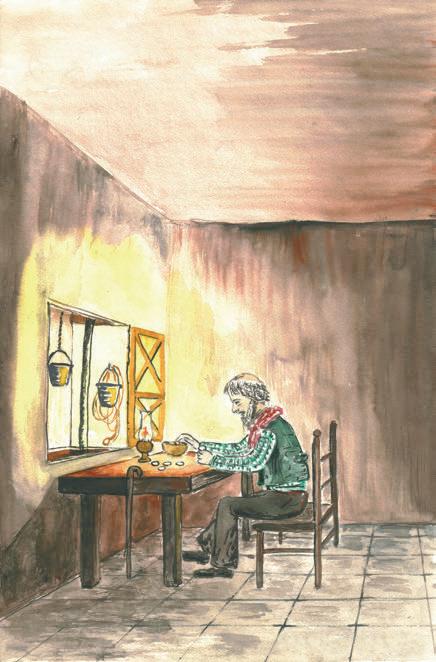 E così li aveva ingannati ancora una volta liquidandoli per sempre. Sicuro che ormai non lo avrebbero più infastidito, andò a riprendersi l’asino e l’oro e continuò il suo cammino. Cammina, cammina... Le tenebre cominciavano a calare e lui e il suo animale non ne potevano proprio più. Arrancavano a fatica, cercando, con le ultime forze, di non cedere alla stanchezza.