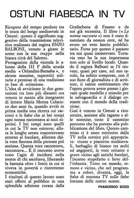 In questo giro di ricerca e di contatto gli operatori ebbero il grande merito di aver consegnato alla nostra videoteca cittadina l’ultima testimonianza di una calcara ancora in funzione e il primo documentario RAI a colori sulla città di Ostuni con il filmato Quando le nonne raccontano, mandato in onda su RAI 2 il martedì del 27 giugno 1978. L’annuncio venne dato in Ostuni tramite manifesti affissi per le vie del paese.