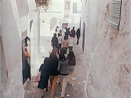 Le alunne della mitica III F per le vie del borgo antico (fotogramma tratto dal servizio televisivo Quando le nonne raccontano, andato in onda su RAI 2 il 27 giugno 1978).