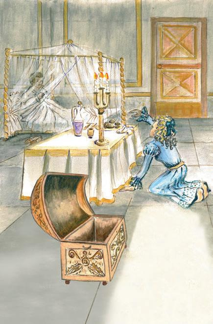 Qui fece per liberarlo dal carico e togliergli il basto ma, per quante volte tentasse di staccare le bisacce e deporle per terra, non le riuscì di smuoverle neppure di tanto. Incuriosita, volle vedere cosa mai contenessero e... oh meraviglia delle meraviglie!... Il luccichio dell’oro le abbagliò la vista e la mente. In preda a una febbre che non aveva mai conosciuto, prese l’asino con il prezioso carico, lo trascinò in uno scantinato, chiuse la porta con un robusto chiavistello e se ne tornò soddisfatta nella locanda.