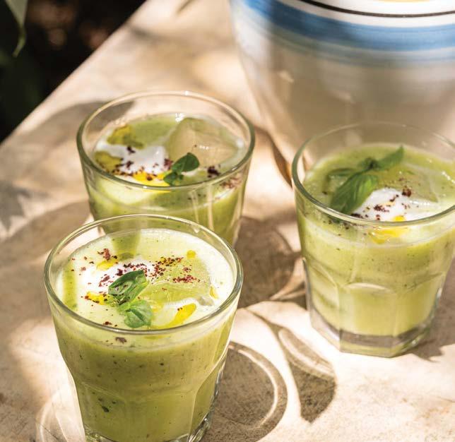 Add everything to a high-speed blender and blend till very smooth. Store in the fridge until ready to serve. Serve on ice with a dollop of yoghurt and a drizzle of olive oil.