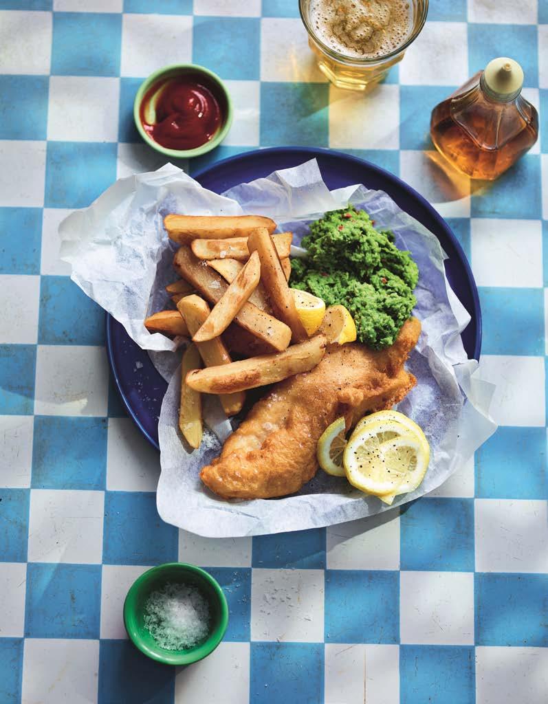 Meanwhile, heat up a frying pan with 1 inch of vegetable oil to 170-190 degrees celsius. Once heated start by adding the fish fillets in the batter mix going back and forth until they're coated well. Gently drop them into the oil counting down from 5 until they’re fully placed in the pan. Repeat with all and cook for 10 mins or until the fish is golden brown and floating. Set aside on a paper towel once cooked.