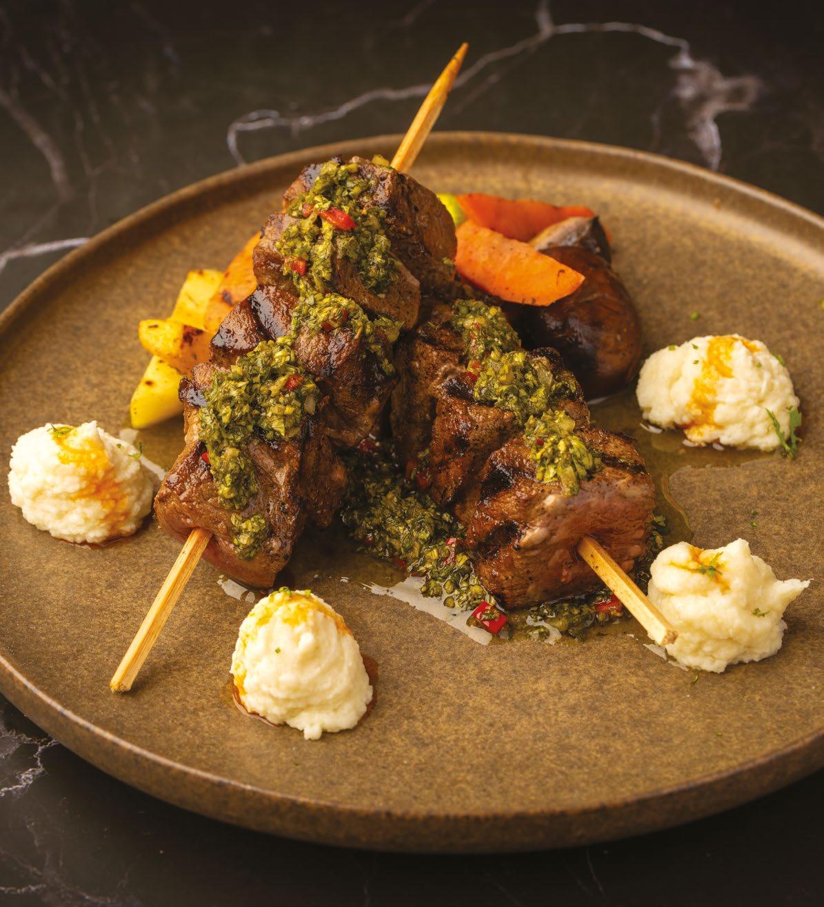 A bold, smoky steak dish paired with fresh chimichurri, creamy mash, sautéed vegetables, and aromatic chili oil for balanced richness.