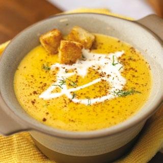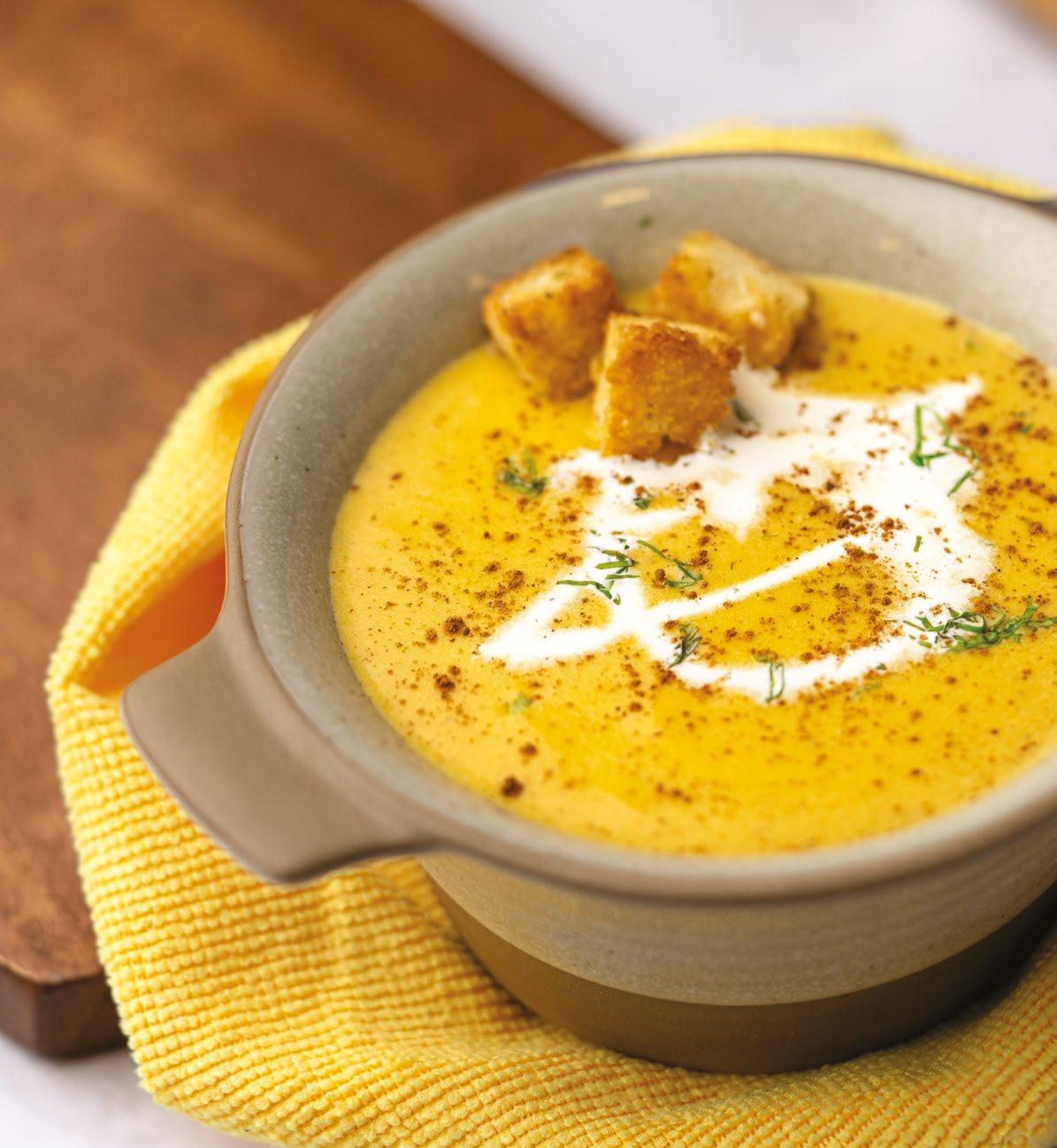 A velvety butternut squash soup with warm spice, crisp brioche croutons, and creamy richness, refined yet comforting for cooler days.