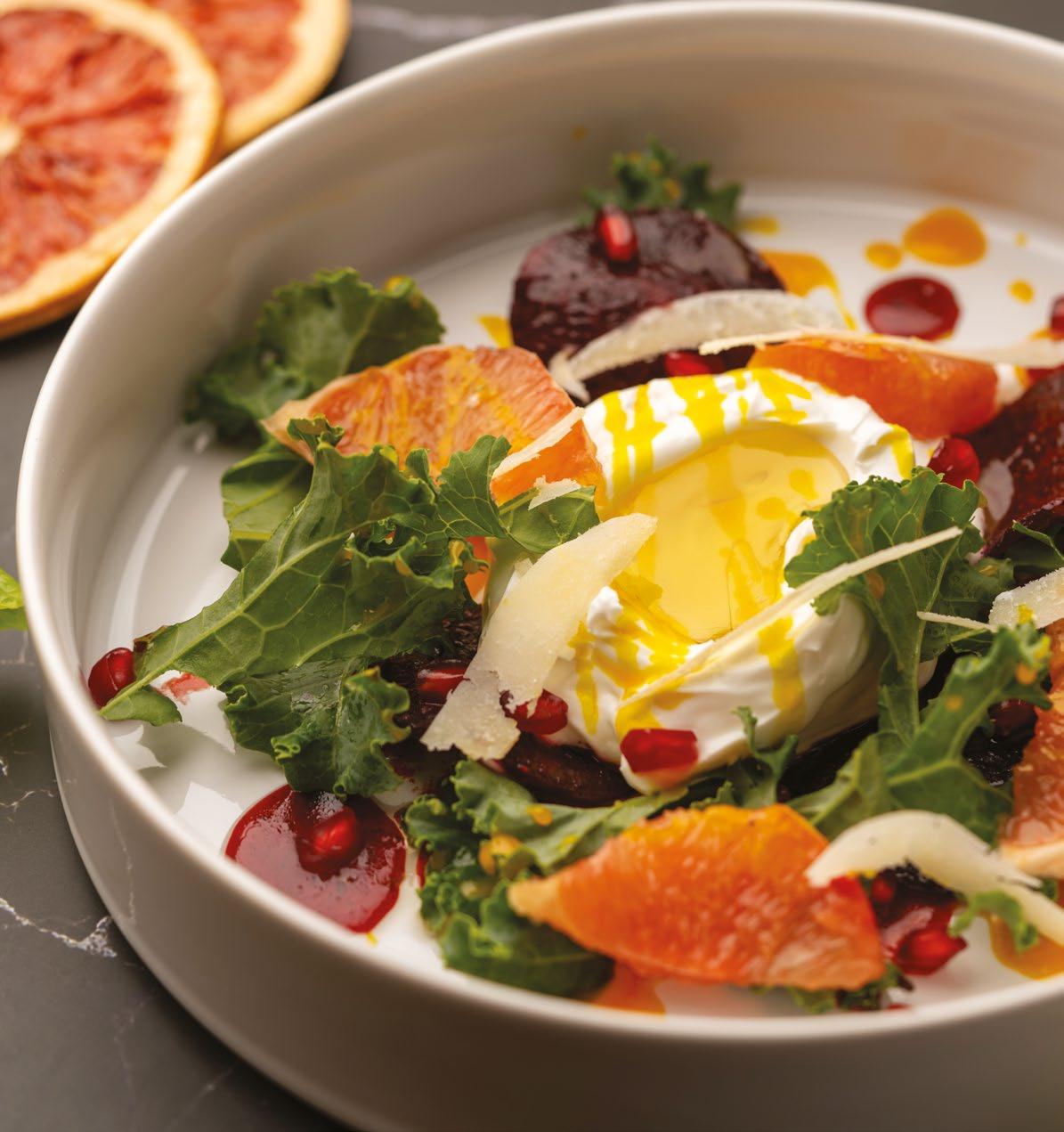 A vibrant citrus salad with burrata, roasted beetroot, kale, and blood orange, balanced by zesty vinaigrette and glossy orange glaze.