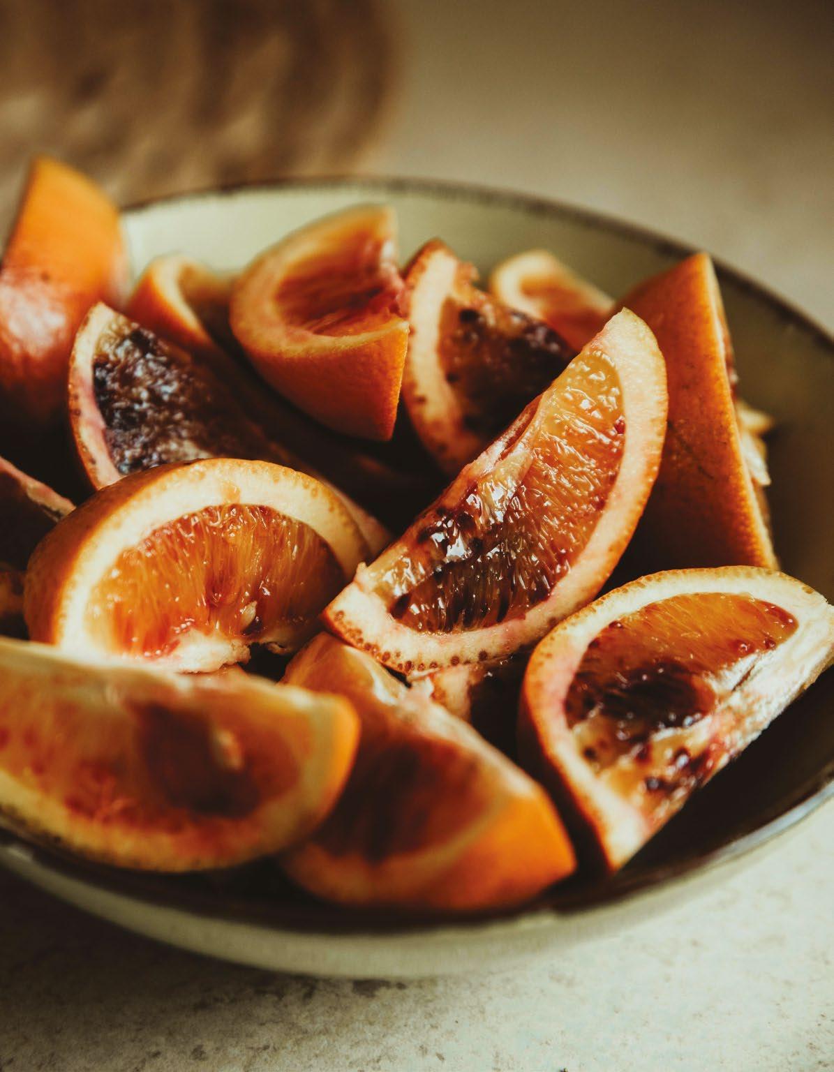 Across these pages, you will find recipes that lean into warmth without heaviness, indulgence without excess. Blood oranges take centre stage this season their brief, vivid appearance reminding us that beauty in food is often fleeting. From marmalades and syrups to vibrant salads and citrus-led desserts, they bring colour and clarity to winter cooking. Their brightness cuts through richness, lifting familiar dishes into something quietly extraordinary.