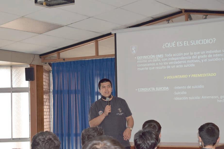 Los psicólogos Juan Espinoza y Nicolás Arriagada explicaron a los jóvenes lo que implica el suicidio, que, según la OMS, lo define como toda acción por la que un individuo se causa a sí mismos un daño, con independen cia del grado de intención y de que conozcamos o no los verdaderos motivos, y el suicidio como la muerte que resulta de un acto suicida.