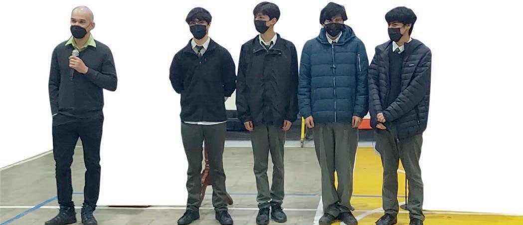 En Sede Norte se reconoció a los alumnos que partici paron en los juegos deportivos escolares, logrando un merecido tercer lugar en la disciplina de basquetbol. Ellos son Javier León Meza de 8°B; Tomas Rojas Ramírez de 8°B; Sebastián Núñez Ve lásquez de 8°B; Luis Rivas Lineros de 1°AHC; Fernando Vásquez de 8°B; Gaspar González de 1° AHC; Tomás Fuentealba de 1°A HC; Octavio Reyes de 7°B y Sebas tián Sandoval de 7°B.