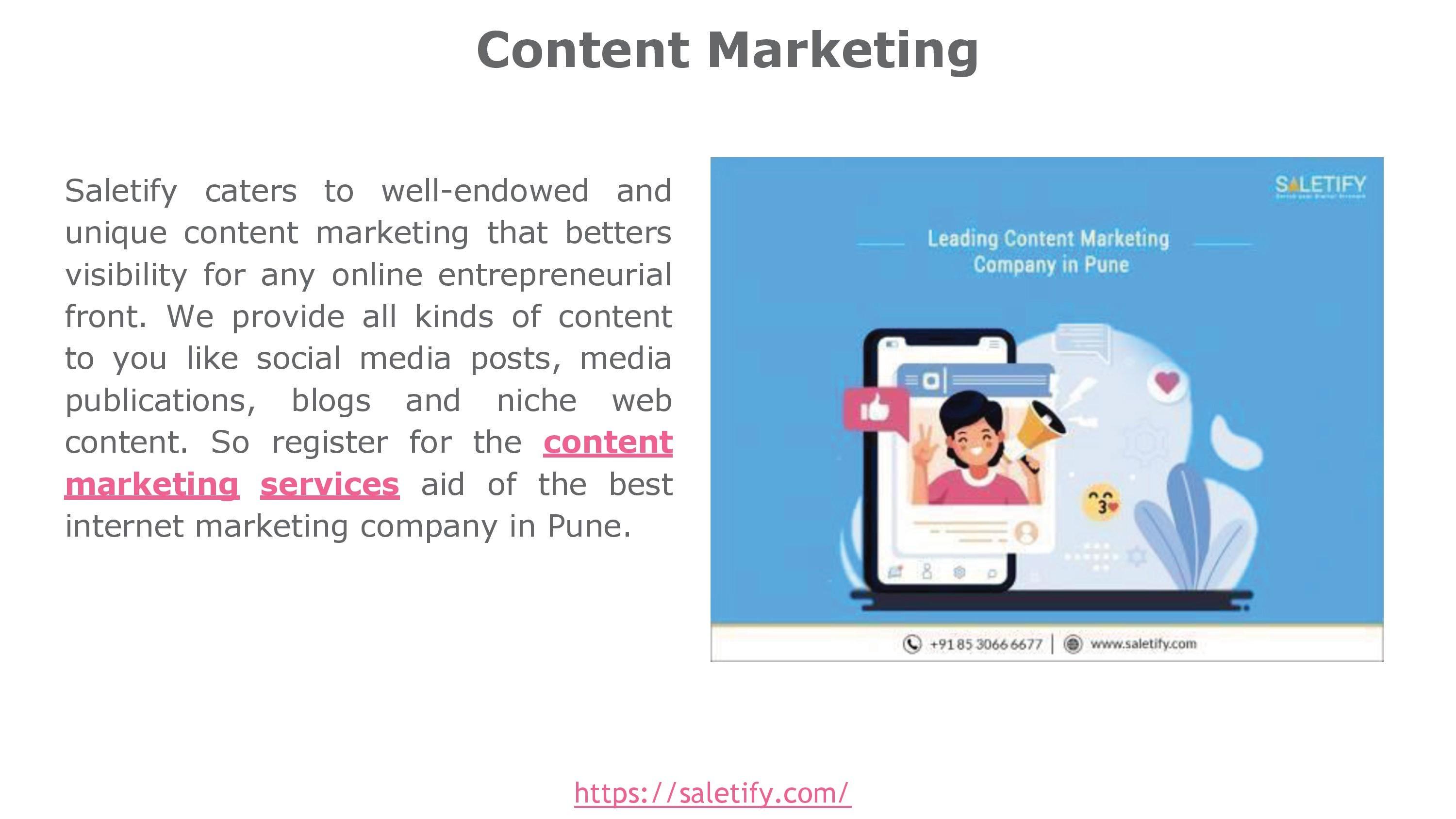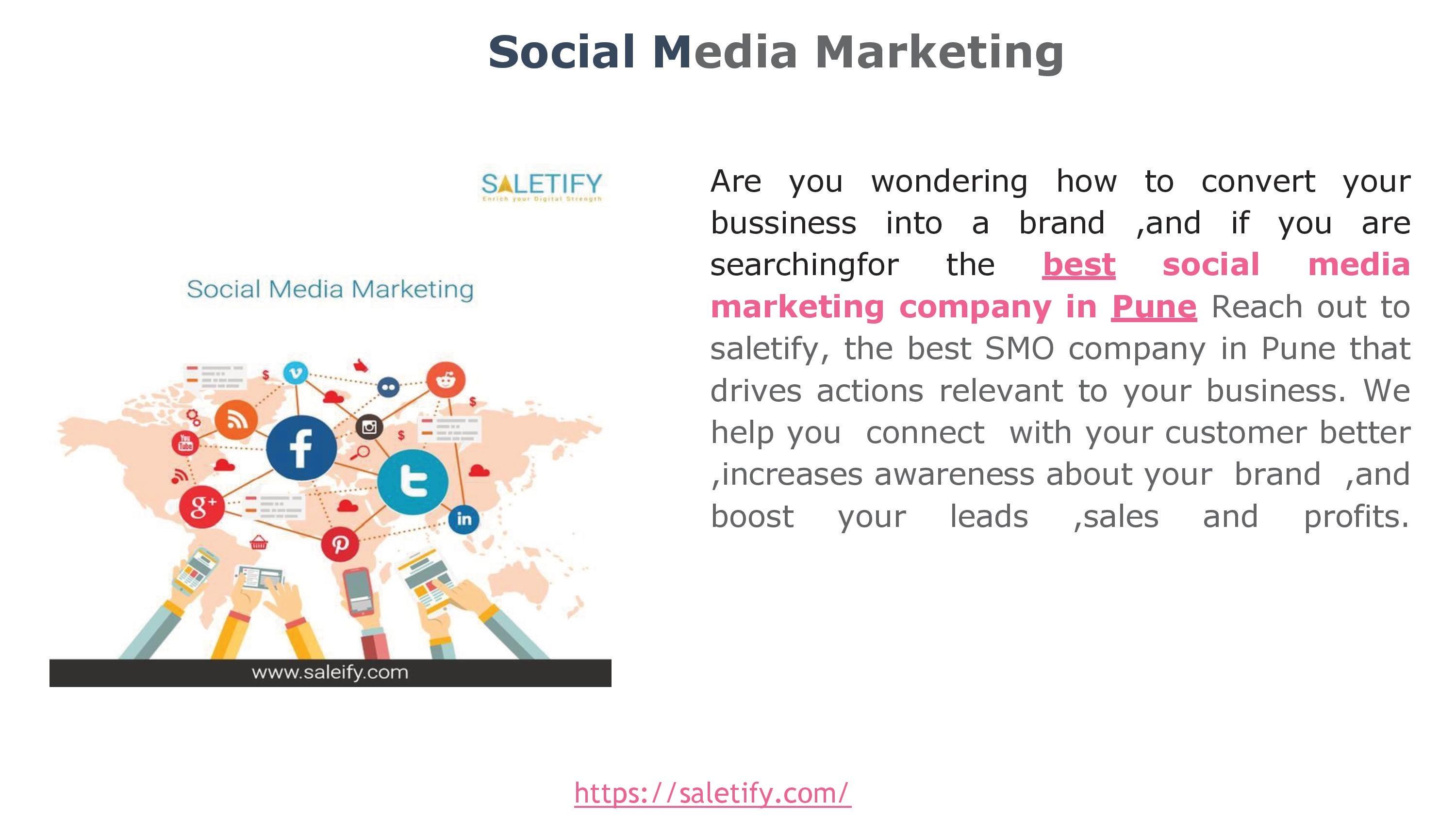 Saletify is a leading Digital Marketing Company in Pune, India. We provide the Digital Marketing Services like SEO, SEM, SMM, Online Reputation Management, Local SEO, Content Marketing, E-Mail Marketing, Conversion Rate Optimisation, Website Development, Pay Per Click, etc. Saletify is the best choice for your business. Saletify helps you to take your business to the top with effective digital marketing services by generating valuable leads for your business. To know more about Digital Marketing Companies in Pune ,Visit Here : https://saletify.com/