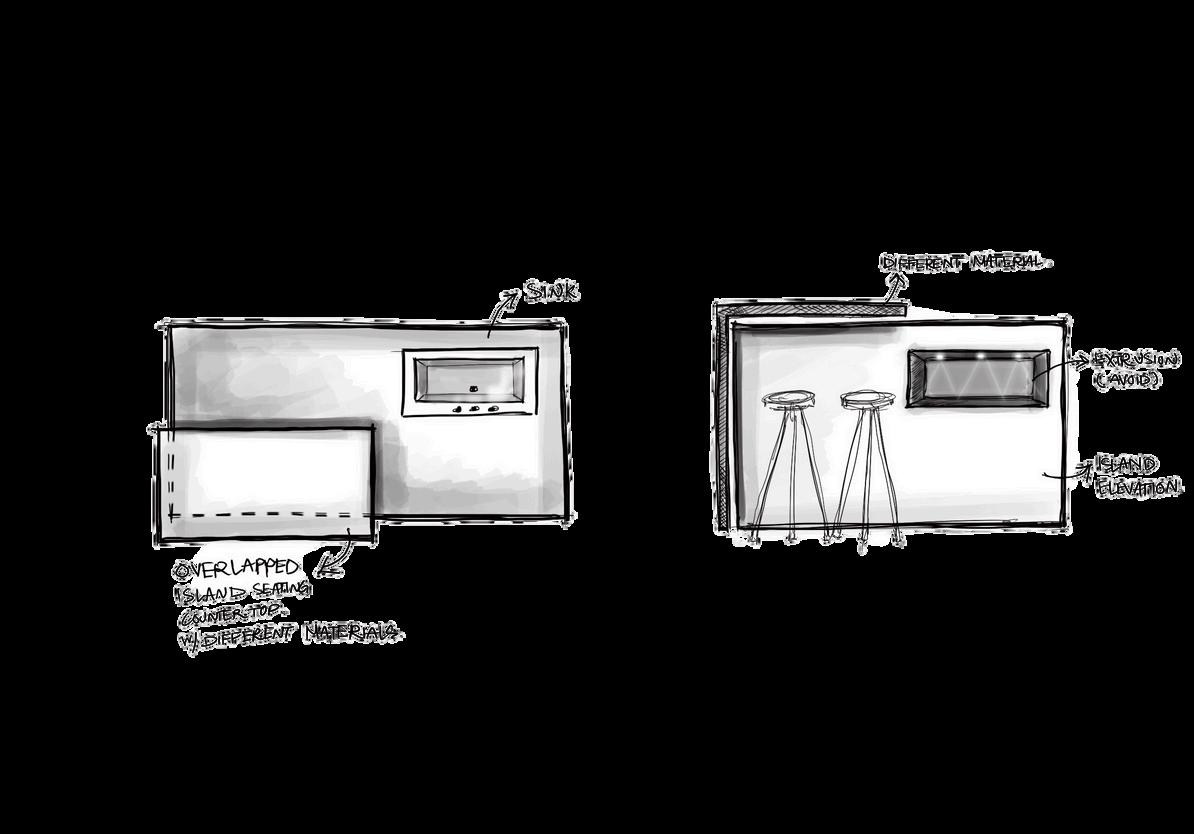 The ceiling design creates a rhythmic flow that naturally draws the eye toward the kitchen island This design element enhances spatial continuity, reinforcing a cohesive connection between the ceiling and the island while complementing the overall aesthetic of the space.