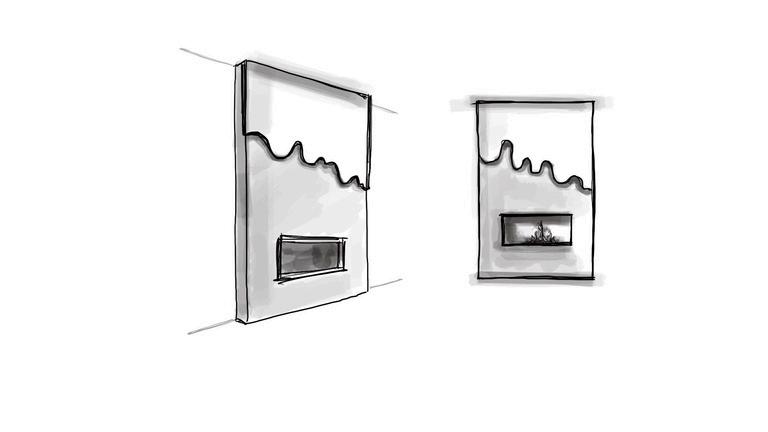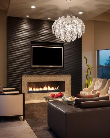 The fireplace design reflects the same concept through the repetition of wood panels at varying heights. These panels enhance visual interest and add warmth and texture, seamlessly integrating aesthetics with functionality