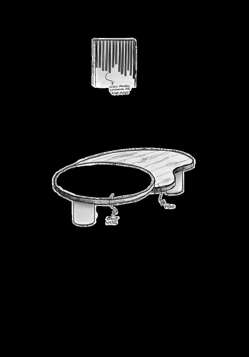 A custom-designed coffee table standing at 1 3" high, inspired by the project’s design concept. Two overlapping pieces create varying heights, symbolizing the interplay of ups and downs and the idea of intersection, adding both functional and conceptual depth to the space