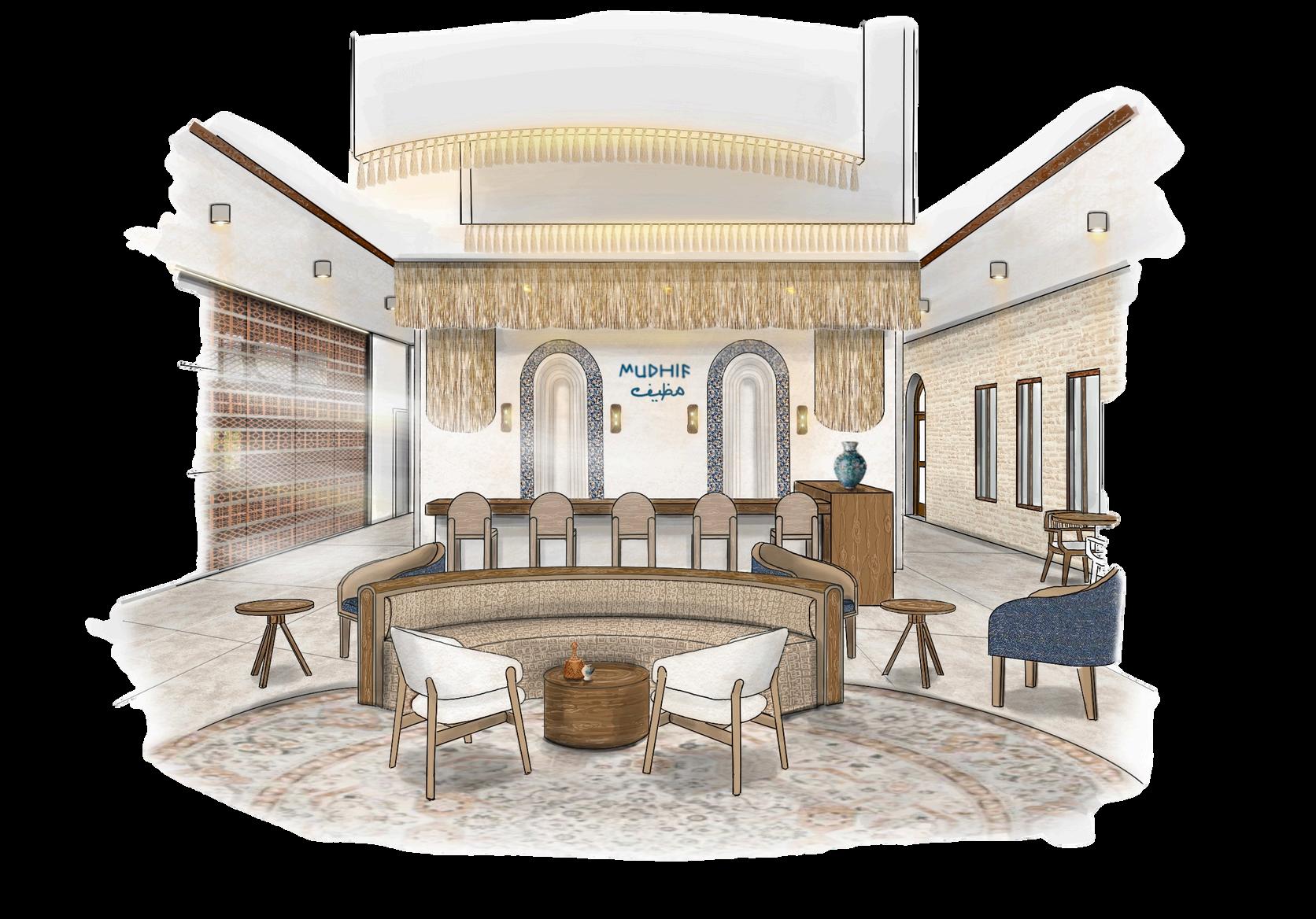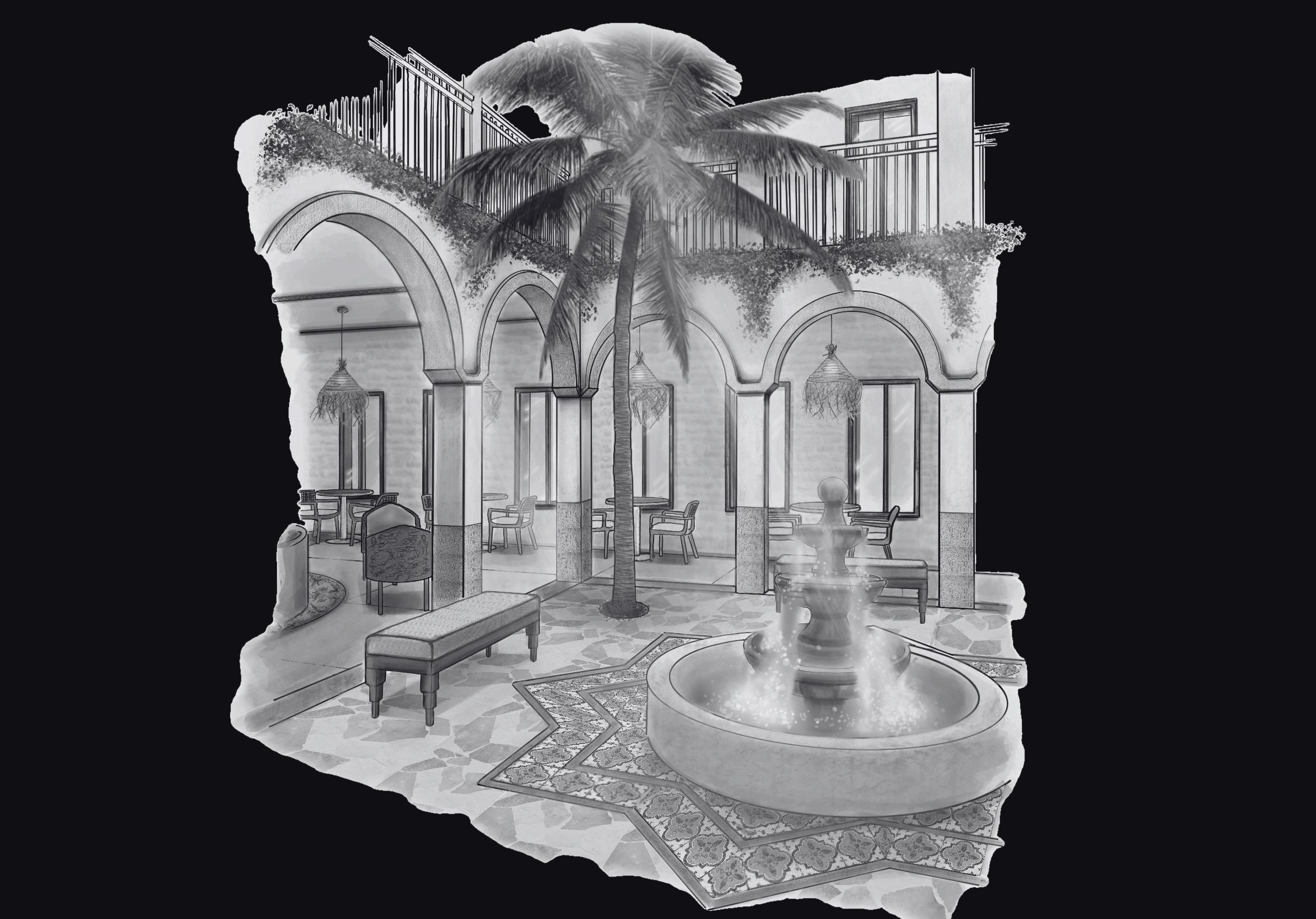 Stepping into the courtyard with ts central water fountain and natura e ements inspired by ancient raqi homes creates a warm invit ng atmosphere for visitors where they can check in and out