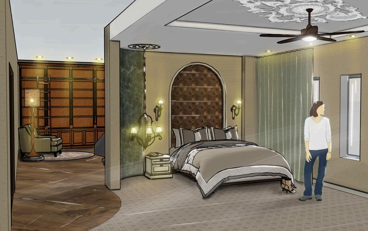 Themasterbedroomfeaturesawarm,elegant designwithanarchedheadboardnichethatadds asenseofgrandeur,intricatewallpaneling,anda curvedpartitionforsubtleprivacy Agreenmarble accentaddssophistication,complementedby vintage-inspiredchandeliersandsconces.The seamlesstransitionbetweencarpetandwood flooringenhancesthesuite’shug-inspiredlayout, creatingacohesiveandinvitingatmosphere